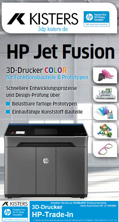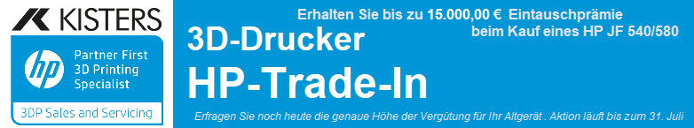 Für eine Rückvergütung - im Rahmen des HP 3D Print Trade-In Programs - berechtigt sind Endkunden, die beim Kauf eines teilnahmeberechtigten neuen HP 3D-Druckers JF 580 oder JF 540 über den authorisierten HP 3D Partner KISTERS - im Zeitraum vom 01.04.2019 bis 31.07.2019 - ihren alten, funktionstüchtigen 3D-Drucker eintauschen. HP muss dazu den Antrag und die notwendigen Dokumente von Ihrem authorisierten HP 3D Print Partners KISTERS innerhalb von 30 Tagen nach Kaufdatum erhalten haben. Dieses Angebot kann nicht mit anderen Werbeangeboten oder bezüglich der berechtigten Produkte geltenden Sonderpreiskonditionen kombiniert werden. HP + KISTERS behalten sich vor die Teilnahmebedingungen jederzeit und ohne Benachrichtigung zu ändern. HP + KISTERS behalten sich vor das Programm aus rechtlichen oder wirtschaftlichen Gründen jederzeit ohne vorhergehende Ankündigung einzustellen. Nur gültig in Deutschland. Gilt nur für neue Produkte. Der Abholung des Altgerätes vom Kundenstandort (Deutschland) wird von HP getragen. Die Abholung muss von der Eingangstür im Erdgeschoss aus erfolgen können. Drucker über 75 kg müssen auf Paletten verpackt werden.
