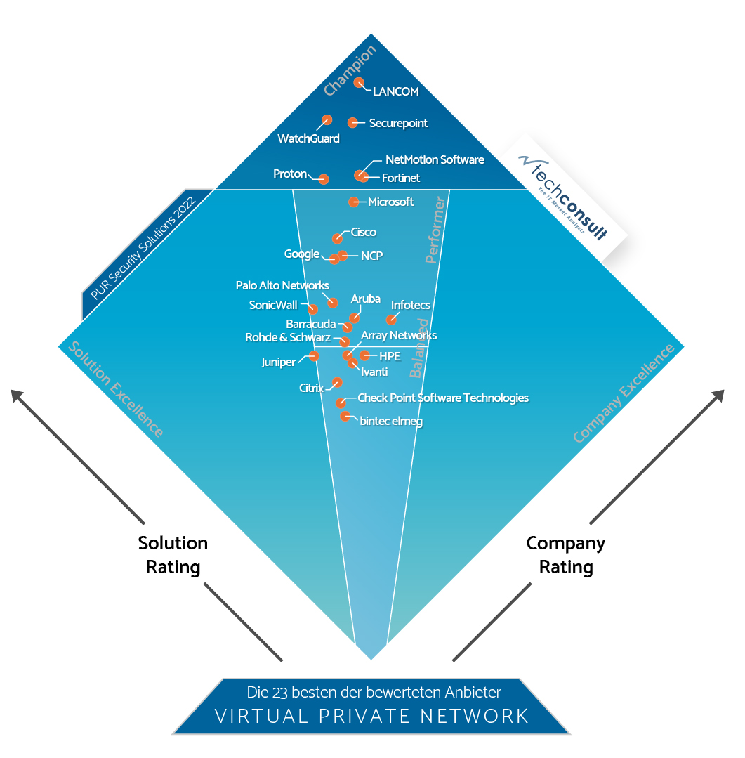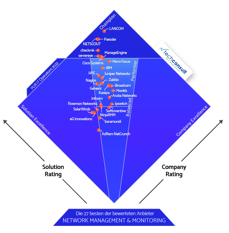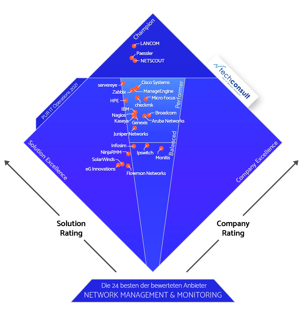 Beim Professional User Rating 2023 von techconsult setzt sich LANCOM Systems im Bereich Netzwerk Management & Monitoring gegen die Konkurrenz durch und sichert sich zum vierten Mal in Folge den Platz an der Spitze des Ergebnisdiamanten. Sowohl die Lösung LANCOM Management Cloud (LMC) als auch der Hersteller überzeugten die Anwender auf ganzer Linie und erhielten ausgezeichnete Bewertungen.