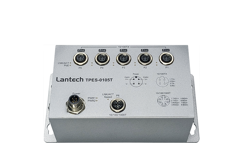 (pressebox) (Klingenberg, 24.04.2024) Lantech T(P)ES-0105T is a 5 10/100 Base-TX + 1 10/100/1000 Base-T (with 5 ports 802.3at/af PoE ports) with M12 connectors unmanaged EN50155 Ethernet switch with IP44 rated protection which meets the high-reliability requirements demanded by industrial rolling stock applications.