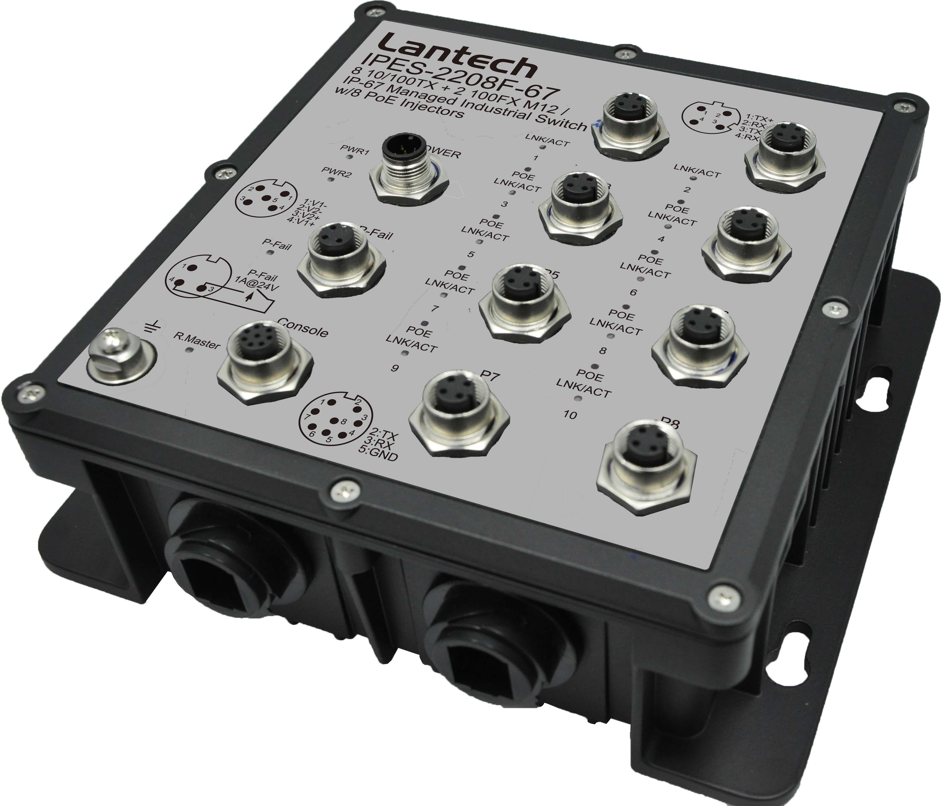 (pressebox) (Klingenberg, 13.08.2010) Lantech IPES-2208F-67 is a 8 10/100 Base-TX + 2 100FX Managed Industrial Switch with 8 PoE injectors. The full SNMP management features are including QoS for 4 queues, 801.q VLAN, IGMP snooping and query mode as well as SNTP and SMTP.