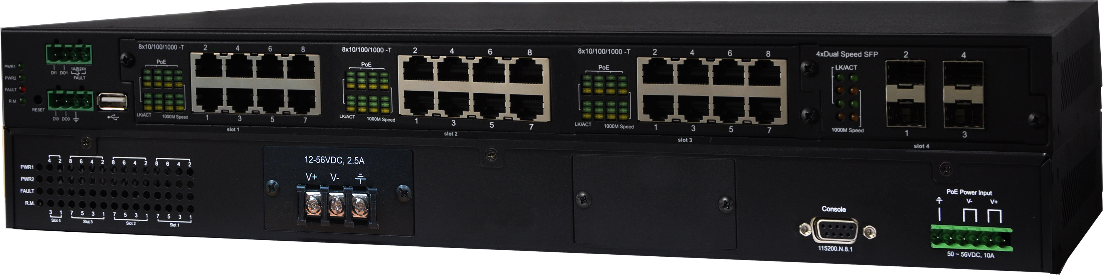 - 24 x 10/100/1000T PoE + 4 DualSpeed SFP Industrial L2+ Switch w/ITU G.8032 ring & PTP