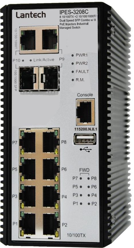 The Lantech IPES-3208C is an 8-port 10/100BaseTX + 2-port 10/100/1000T/Dual Speed SFP Combo industrial switch w/8 POE 802.3af/at Injectors. The SFP connection is suitable with 100M or 1000M Dual Speed. The advanced SNMP management features include QoS for 4 queues, 802.1q VLAN, IGMP snooping and query, SSH/SSL, DDM(need to work with SFP that has diagnostic function), loop protection, Mac address per VLAN, SNTP and SMTP. It also supports Cisco Discovery Protocal(CDP) and LLDP for Ciscoworks to detect the switch info to be shown on L2 map topology. The user friendly UI with auto-topology drawing makes IPES-3208C much easier to get hands-on and monitoring