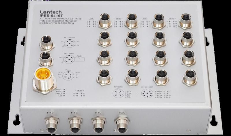 Lantech IPES-5416T-16 (IP67/IP43) is a high performance L2+ (Gigabit uplink) switch with 16 10/100TX + 4 10/100/1000T w/16 PoE 802.3af/at Injectors by M12 provides L2 wire speed and advanced security function for network aggregation deployment. It delivers ITU G.8032 ring recovery less than 20ms, comprehensive QoS, advanced security including ACL L2/L3, SSH/SSL, DHCP Option 82, DHCP server, IGMPv1/v2/v3/router port, QinQ (double tag VLAN) , and MVR (multicast VLAN registration), which are important features required in large network. It also supports Cisco Discovery Protocol (CDP) and LLDP for Ciscoworks to detect the switch info and show on L2 map topology.
