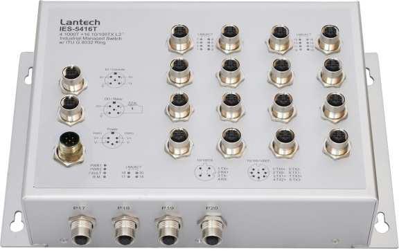 Der Lantech IES-5416T (IP67/IP43) ist ein Hochleistungs-L2 + Gigabit Uplink-Industrieswitch mit 16x10/100TX + 4 1000T über M12-Steckverbinder, der L2 Drahtgeschwindigkeit und erweiterte Sicherheitsfunktion für den Anschluss von PD-Netzwerk bietet. Der Switch beherrscht ITU G.8032 Ringrekonfiguration und -wiederherstellung in weniger als 20 ms, QoS, IGMPv1/v2/v3 & Router- Port, QinQ, (Doppel Tag VLAN), MVR (Multicast VLAN Registration), LACP Link Aggregation und erweiterte Sicherheit mit ACL, TACAS +, SSH / SSL, DHCP Option 82, alles wichtige Funktionen, die in großen Netzwerken erforderlich sind. Es unterstützt auch das Cisco Discovery Protocol (CDP) und LLDP für Ciscoworks, um Switchinformationen auf L2 Karten-Topologie anzuzeigen. Die benutzerfreundliche Oberfläche, eine innovative Auto Topologie Erstellung und die Topologie-Demos machen den IES-5416T (IP67/IP43) um vieles einfacher zu bedienen. Die vollständigen CLI ermöglichen professionelle Einstellungen über die Kommandozeile.
