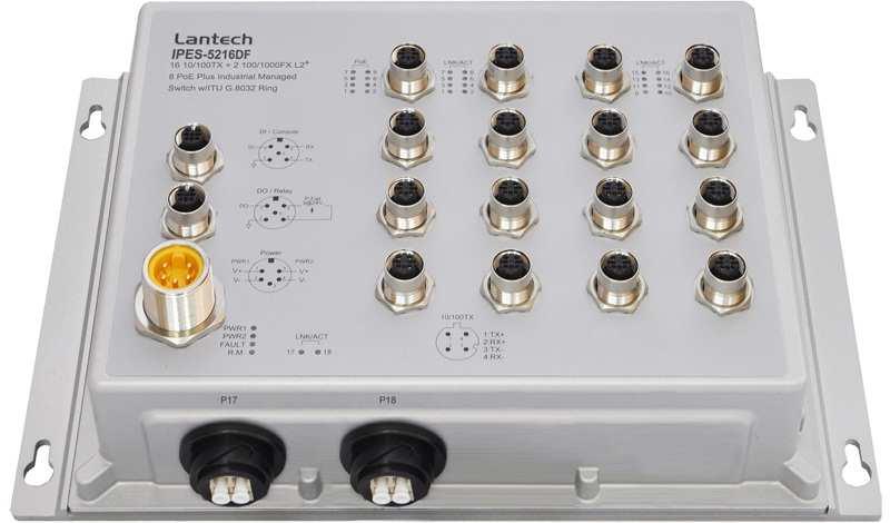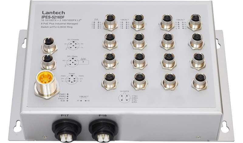 Lantech IPES-5216DF (IP67/IP43) features high reliability and robustness coping with extensive EMI/RFI phenomenon, environmental vibration and shocks usually found in factory, substation, steel automation, aviation, mining and process control. It is the best solution for Automation, transportation, surveillance, Wireless backhaul, Semi-conductor factory and assembly lines.
