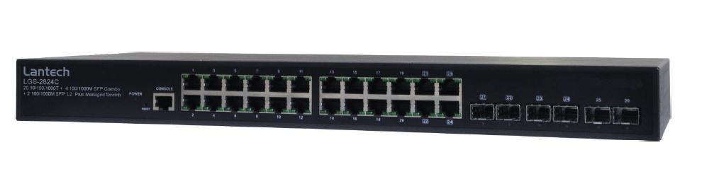 Lantech LGS-2624C is a 20-port 10/100/1000 Base-TX + 6 100 /1000M SFP L2 managed switches which supports full SNMP features, including QoS for 4 queues, 801.q VLAN, IPv6, IGMP snooping and query mode as well as SNTP and SMTP.