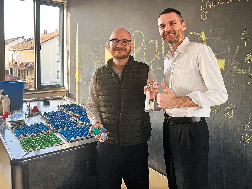 Sven Schreiber (r.) von LASER COMPONENTS überreicht die Sachspende an Stefan Leichtle (l.) vom JUZ Olching