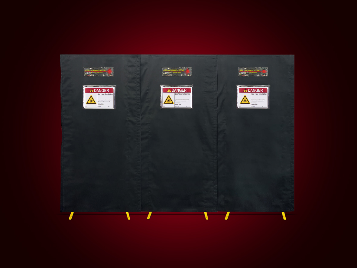 Der schwarze Laserschutzvorhangstoff der SERVICE-RIGHT®-Stellwände ist nach EN 12254 zertifiziert und schützt zuverlässig für 100 Sekunden vor Laserleistung bis 425 W/cm². Er ist für Wellenlängen 190–10.600 nm ausgelegt und bei 1070 nm zertifiziert. Jede Barriere besteht standardmäßig aus drei Paneelen von jeweils 0,9 m × 1,82 m (B × H). Die einzelnen Wände werden wahlweise über Reiß- oder Klettverschlüsse verbunden. Bei einem Gesamtgewicht von 19 kg lässt sich die Barriere problemlos in der mitgelieferten Tragetasche transportieren und schnell vor Ort aufstellen.