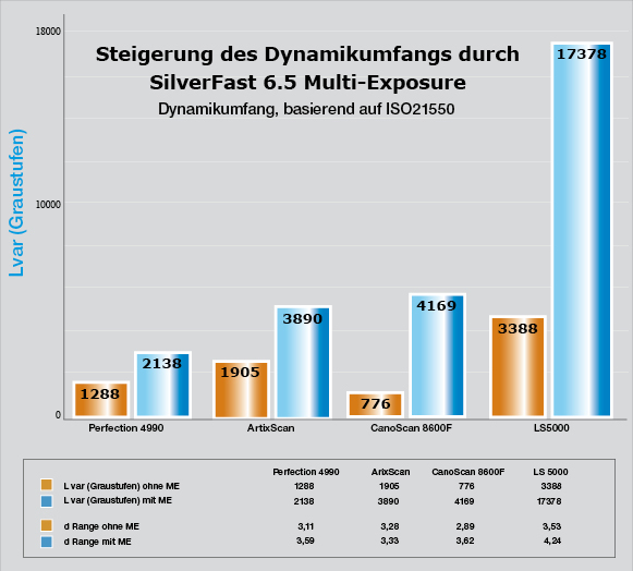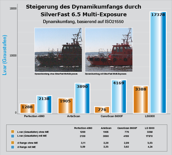 (pressebox) (Kiel, 19.12.2007) Mit der SilverFast Scansoftware wird der effektiv nutzbare Dynamikumfang vieler Scanner, basierend auf der ISO Norm 21550, oftmals mehr als verdoppelt.SilverFast Multi-Exposure, (Patent angemeldet) eine Funktion der SilverFast Versionen SilverFast SEPlus und Ai IT8 Studio, sorgt für bestmögliche Bildqualität und erzeugt durch die Mehrfachbelichtung maximale Bilddynamik und deutlich reduziertes Bildrauschen beim Scannen von Durchlichtvorlagen. SilverFast Multi-Exposure macht auch in hellsten und dunkelsten Bildpassagen feinste Nuancen sichtbar. Im Gegensatz zum konventionellen Multi-Sampling wird das Original mehrfach mit unterschiedlichen Belichtungsintensitäten gescannt. Der effektiv nutzbare Dynamikumfang vieler Scanner wird oftmals mehr als verdoppelt.