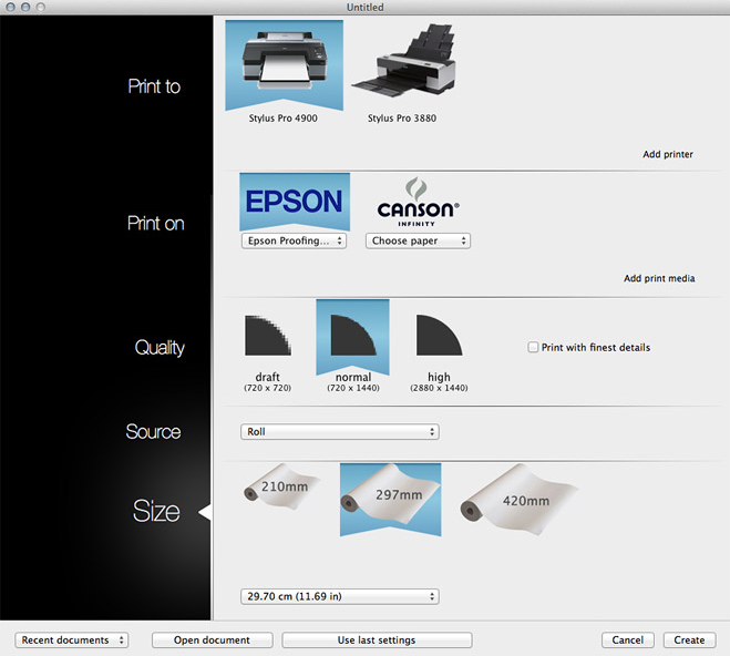 Neue Dokumente werden durch die Auswahl von Druckermodell, Tinte, Papiersorte und -größe sowie die Art der Papierzufuhr erstellt. PrinTao 8 ermöglicht vom Hauptfenster aus direkten Zugriff auf bestehende iPhoto®-, Aperture®- und Lightroom®-Bibliotheken genauso wie zu anderen lokalen Foto-Dateiordnern.