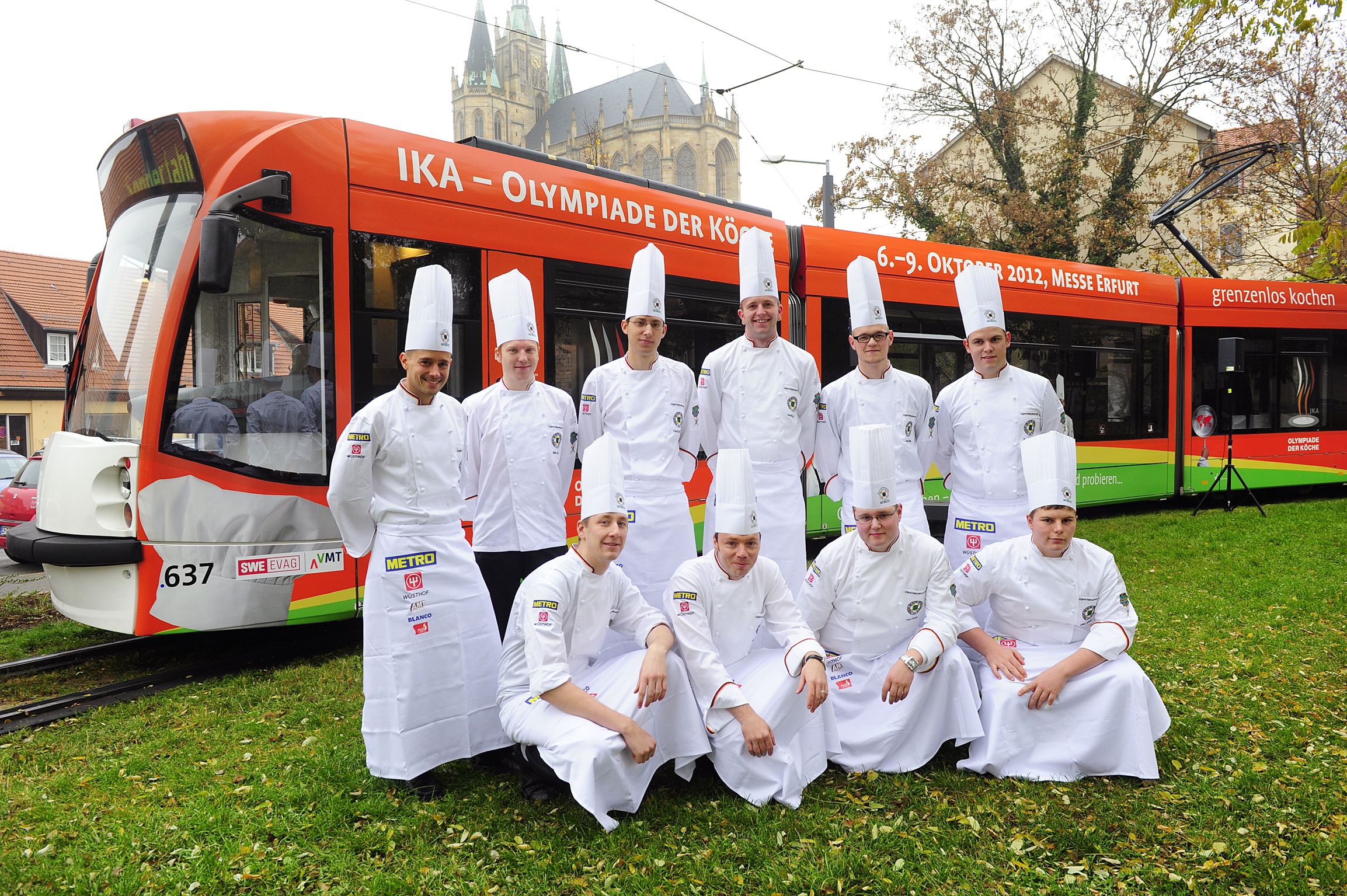 "Das ist eine tolle Idee, dass extra für die Olympiade eine Straßenbahn durch Erfurt fährt" findet Markus Wolf, Trainer der deutschen Jugendnationalmannschaft des Verbandes der Köche Deutschlands Diese trainiert heute schon im Kaisersaal für die Olympiade im Oktober 2012. Trotz des Trainingsstress haben sie sich die Zeit genommen, heute Morgen die neu gestaltete Straßenbahn in Augenschein zu nehmen.