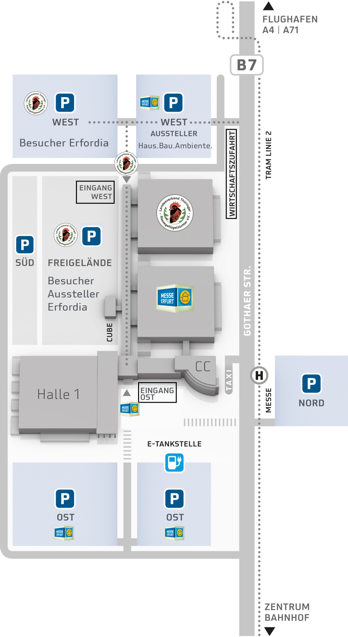 Die Messe Erfurt ist auf den Besucheransturm bestes vorbereitet und stellt knapp 1.000 zusätzliche Parkplätze bereit. Anreisende Besucher aus Richtung Westen (A4 und A71/B7) werden über die Wirtschaftseinfahrt der Messe auf den Zusatz-Parkplatz West geleitet. Von dort gelangen sie über den Messeeingang West überdacht in die Konzerthalle 1 (siehe Anfahrtsplan). Die Zufahrt ist ausgeschildert.