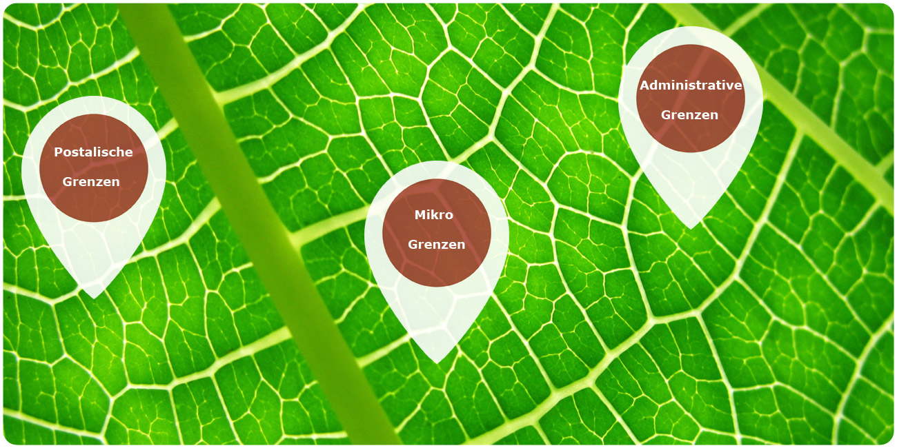 Beispielhafte Darstellung der postalischen, adminstrativen und mikrogeographischen Gebietsgrenzen für Berlin, Deutschland.