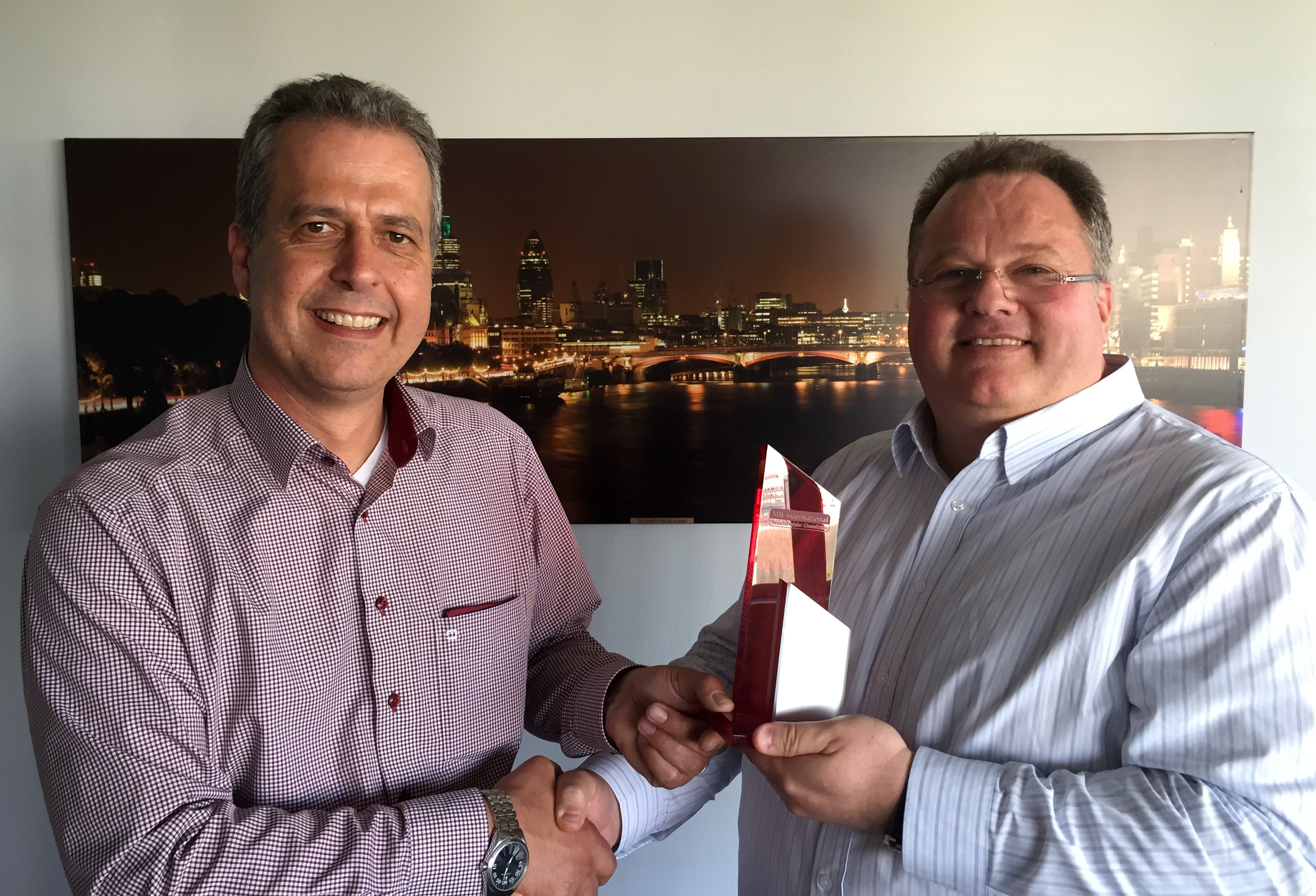 Fastest growing International Partner 2014 - Photo (from left to right): Andy Bell (Director Global Data Product Management, Pitney Bowes), Ray Roberts-York (Managing Director, MB-International)