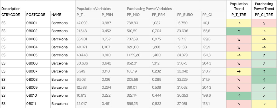 Table showing an extract of the MBI Trends for Purchasing Power and Population in Barcelona, Spain as an exemplary illustration