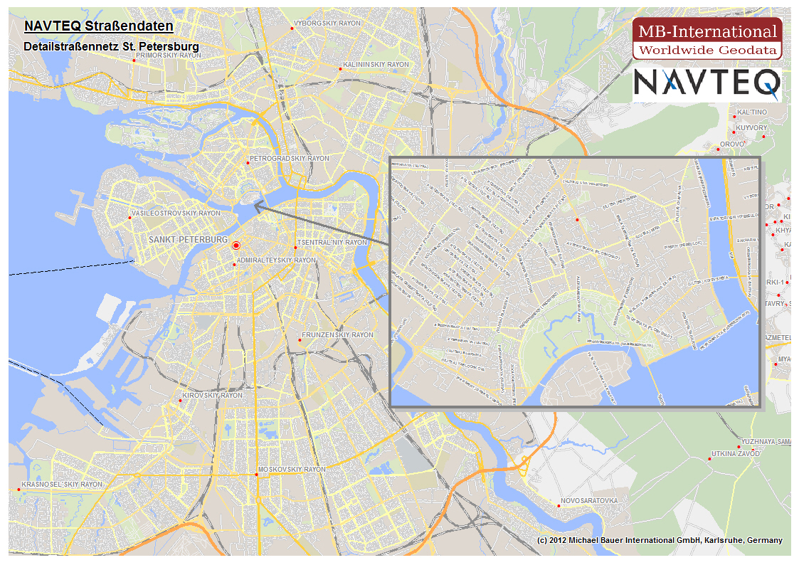 Die digitale NAVTEQ-Kartendatenbank gewährleistet eine hohe Detailgenauigkeit, Vollständigkeit und Qualität für Europa, Nordamerika und zahlreiche Weltmärkte. Übliche Anwendungsbereiche sind z.B. Tracking, Telematik, Flottenmanagement oder klassische Geomarketinganwendungen wie internationale Standort- und Expansionsanalysen. Michael Bauer International GmbH stellt die Daten zur Verwendung in einem Geographischen Informationssystem in allen gängigen Formaten wie *.tab für MapInfo Professional oder shape (*.shp) für ESRI ArcGIS oder ArcView zur Verfügung.