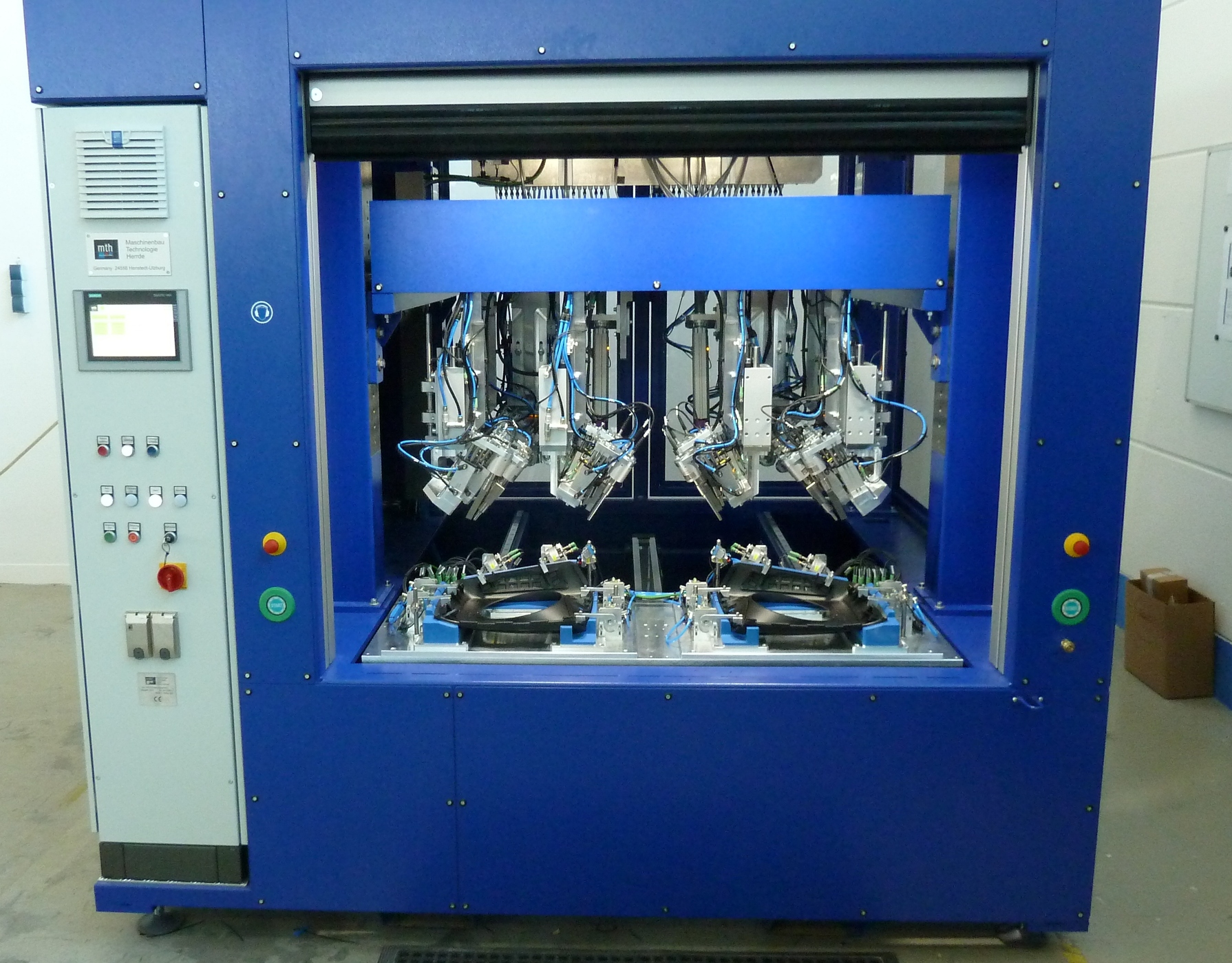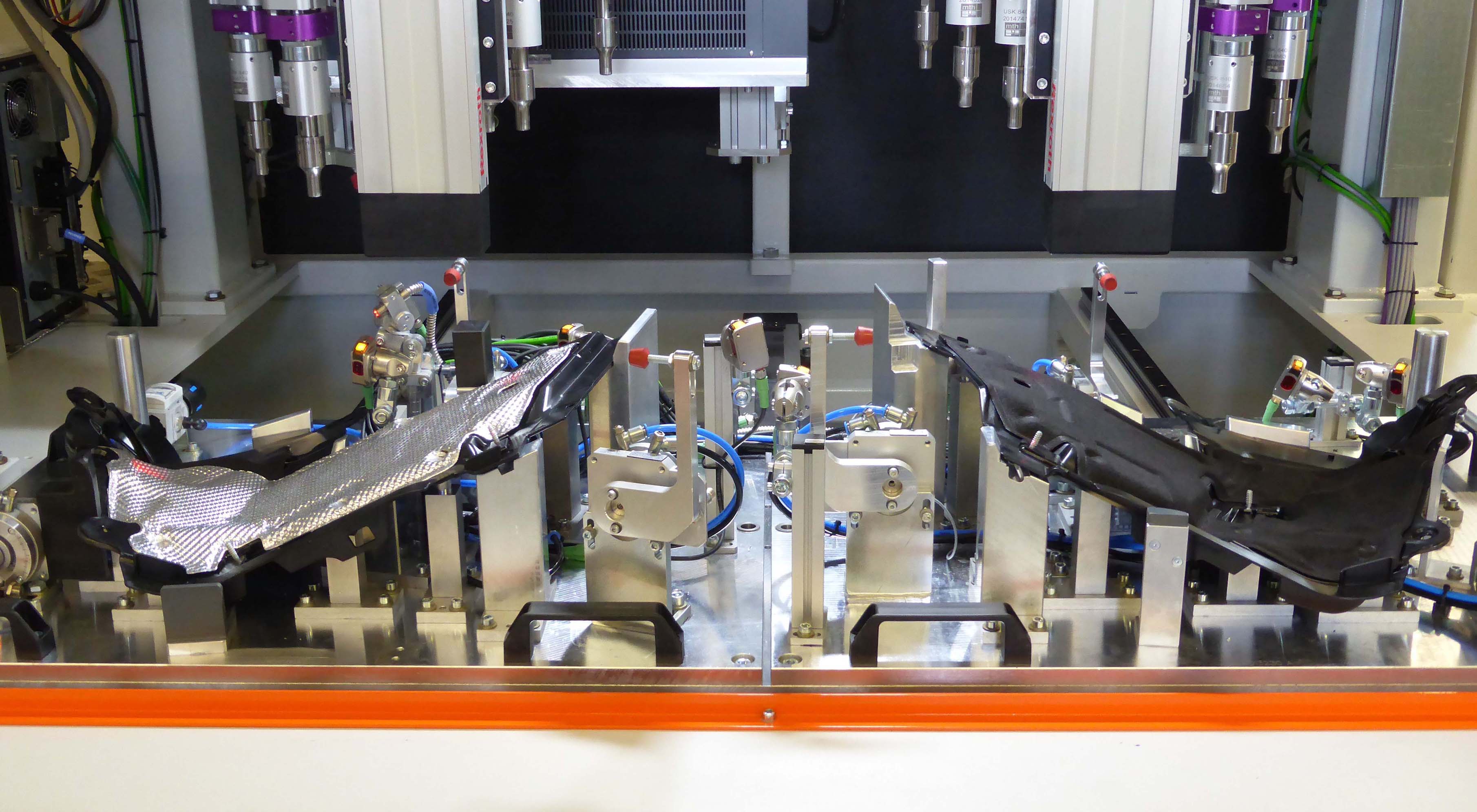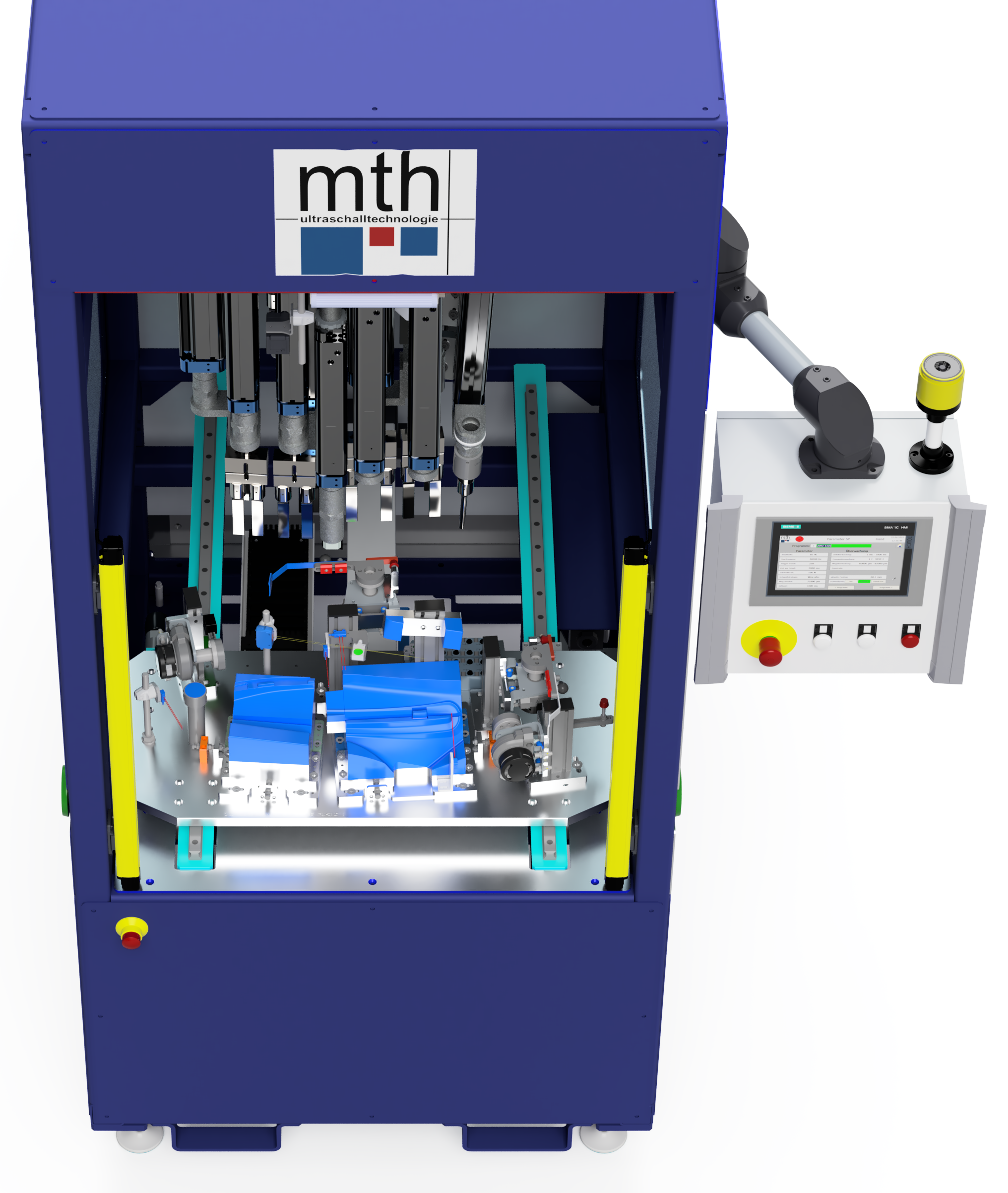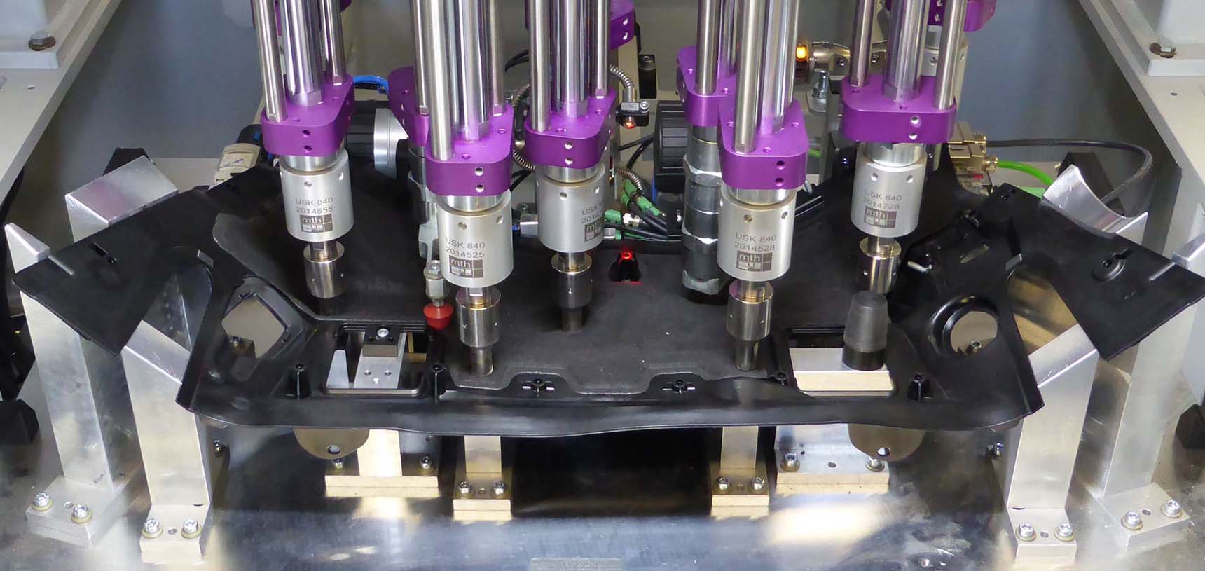 Von mth für die VW-Produktion entwickelte Sondermaschine – mit ihrer Hilfe wird ein kompletter Handschuhkasten eines Sportvans in verschiedenen Varianten mit über 100 Schweißpunkten mittels Ultraschall verbunden