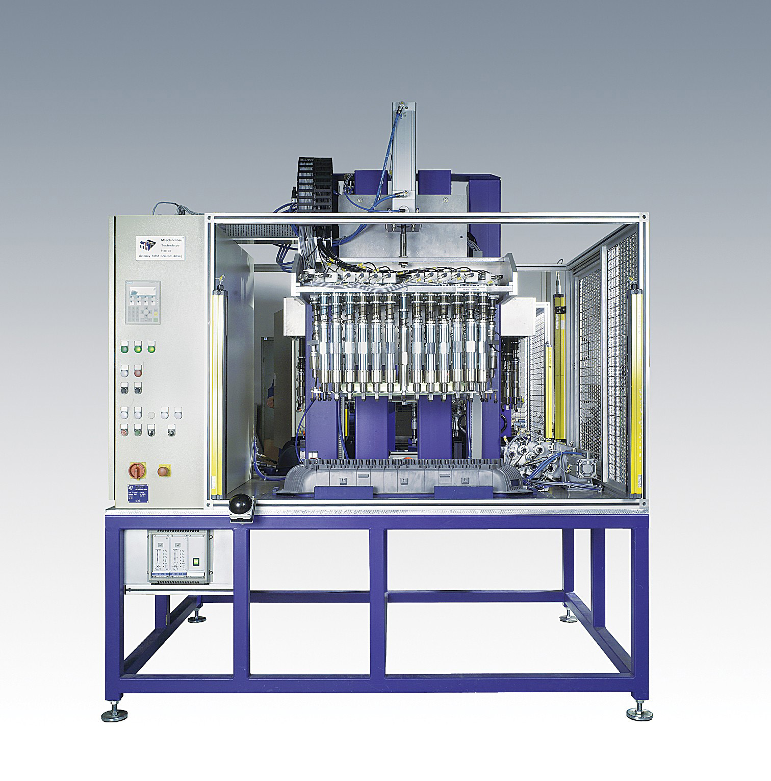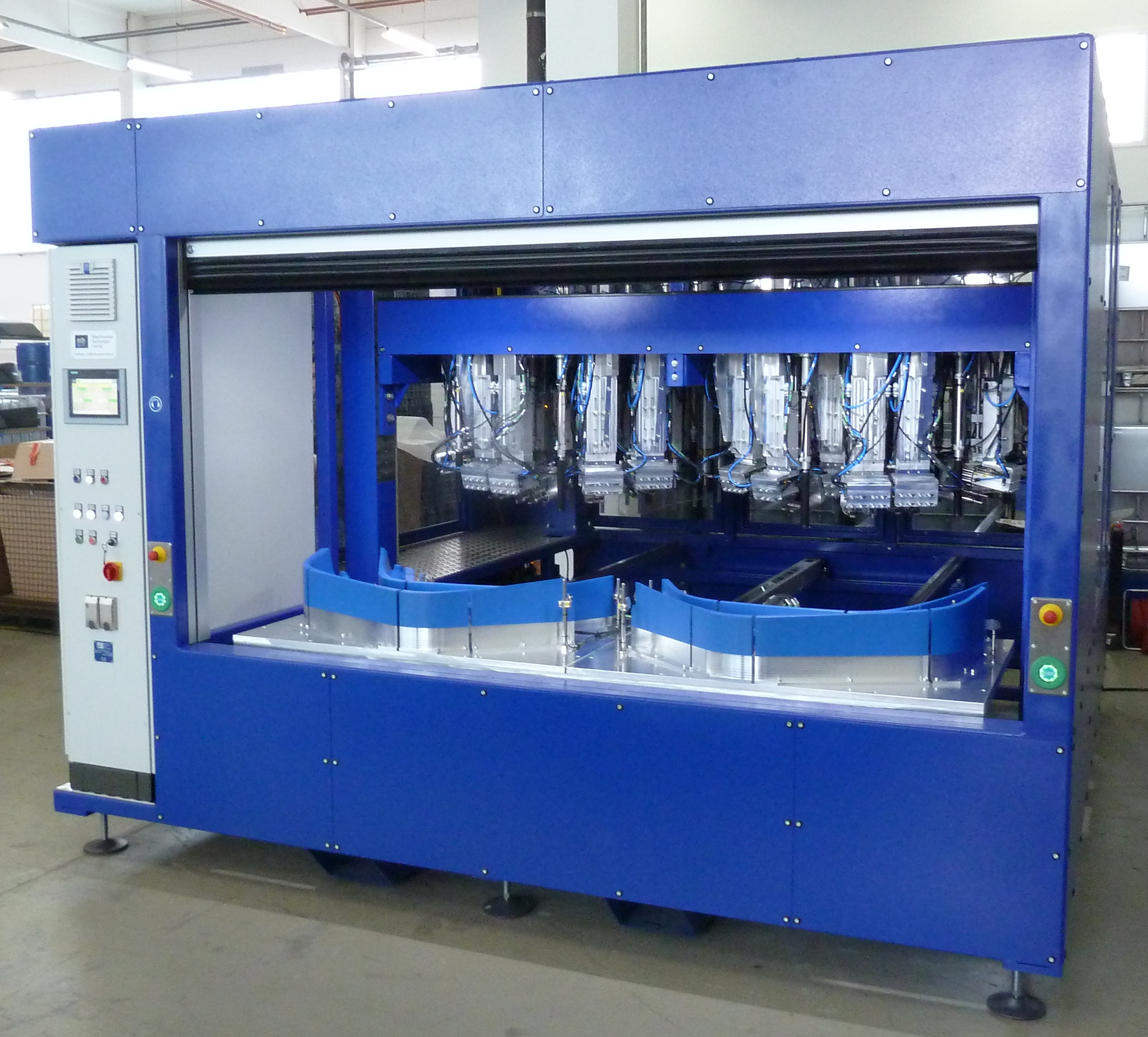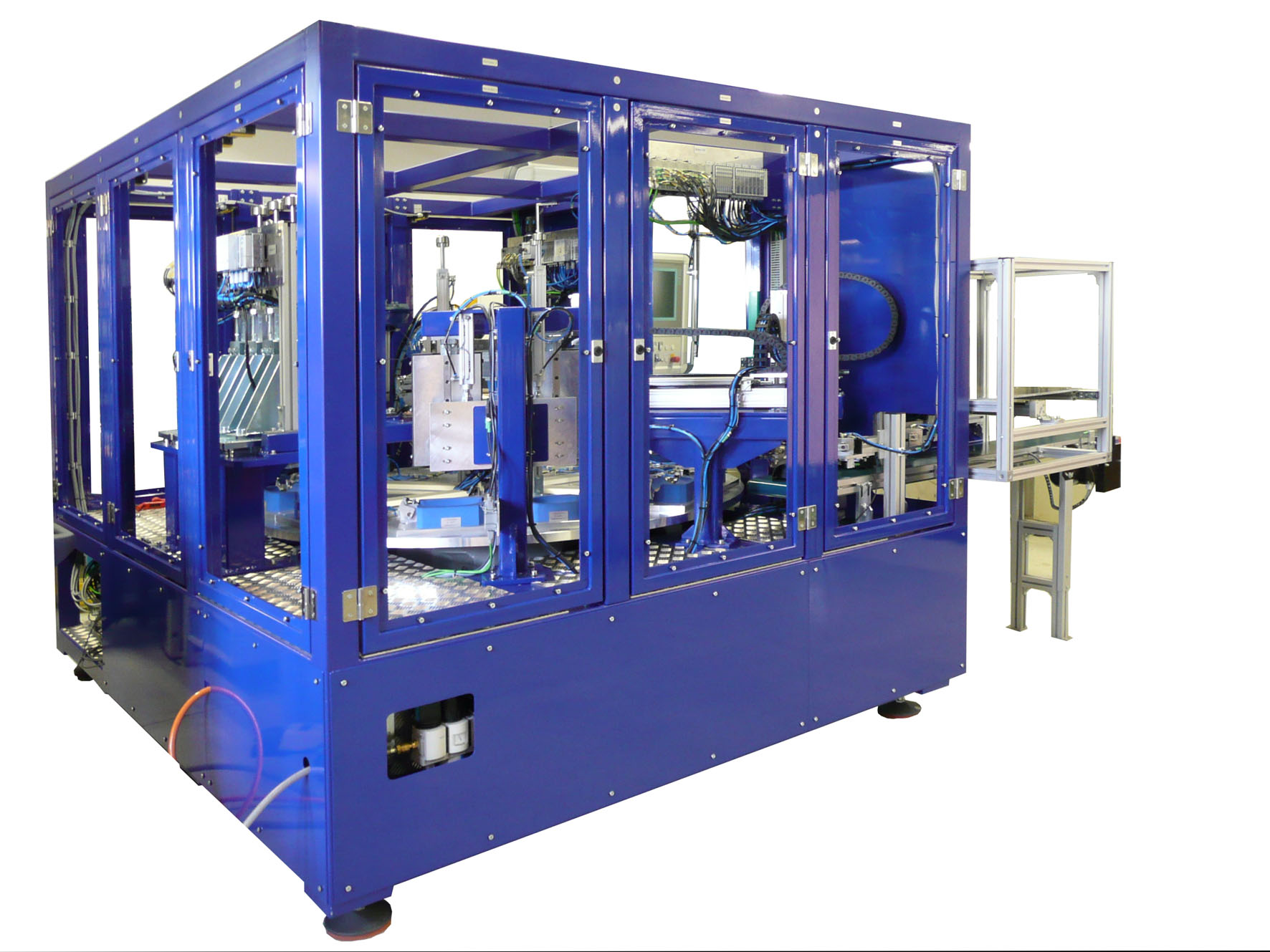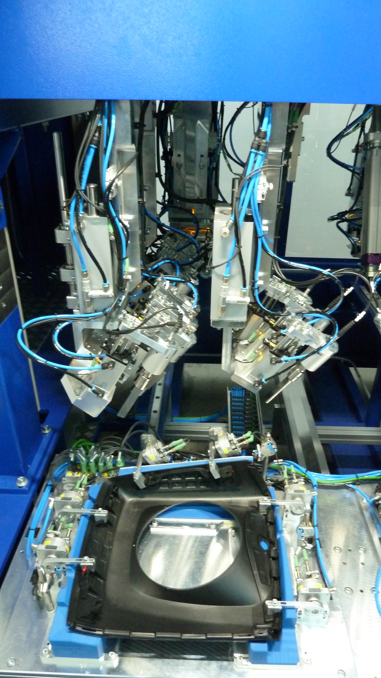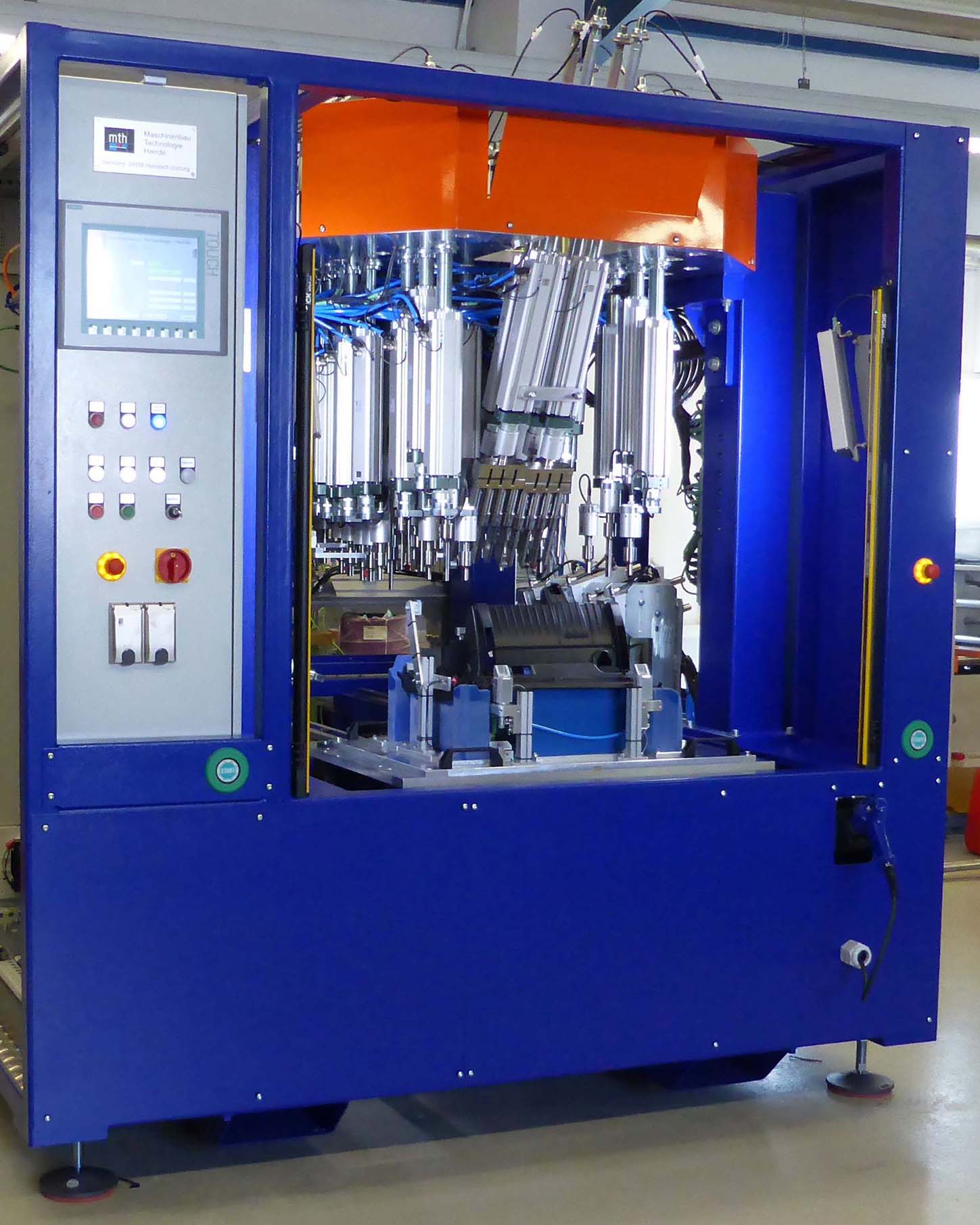 Von mth für die VW-Produktion entwickelte Sondermaschine – mit ihrer Hilfe wird ein kompletter Handschuhkasten eines Sportvans in verschiedenen Varianten mit über 100 Schweißpunkten mittels Ultraschall verbunden