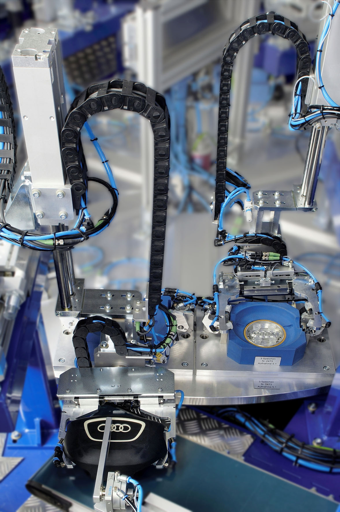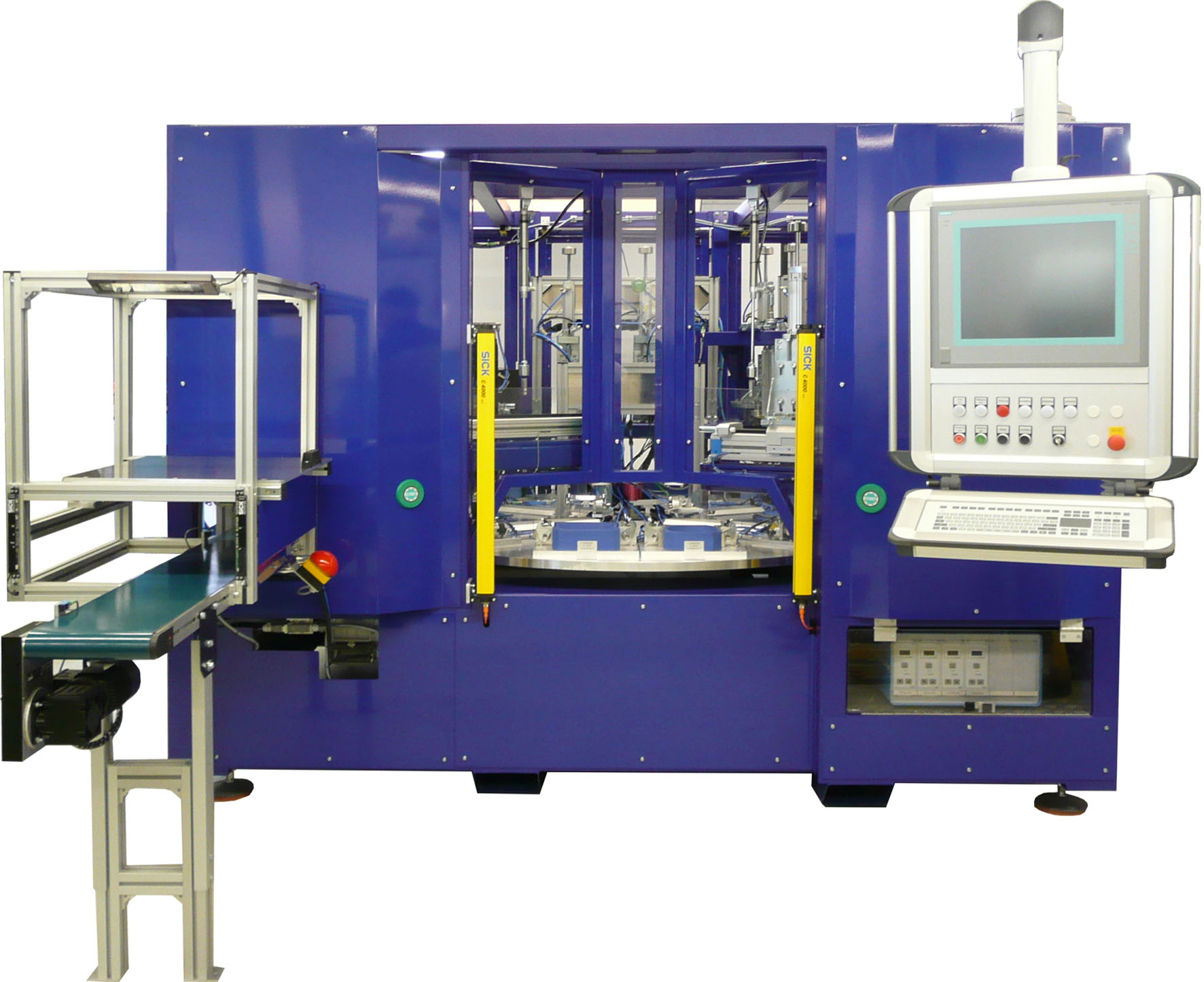 Von MTH im Auftrag der OSBRA Formteile GmbH gefertigte Sondermaschine für das Ultraschallschweißen von Kunststoffen bei der Produktion von Radabdeckungen / MTH – Maschinenbau Technologie Herrde e. K.