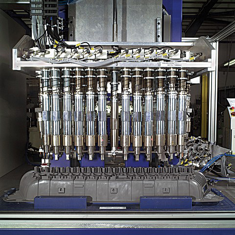 Spezielle mth-Vorschubeinheiten der Schweißwerkzeuge arbeiten mit sehr geringen Reibungskräften und führen die Sonotroden hoch präzise. Jeder einzelne Schweißpunkt entspricht hier einem Pneumatikzylinder und kann mit seinem eigenem Arbeitsdruck gefahren werden, ohne dass 100 Proportionaldruckventile oder Handregler verwendet werden müssen