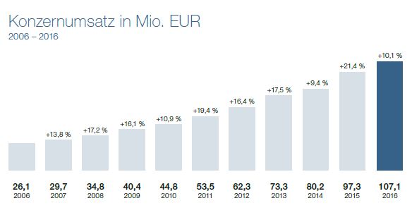 In 2016 hat sich der Umsatz um 10,1 % von TEUR 97.269 auf TEUR 107.051 erhöht. Im Geschäftsbereich Healthcare Software betrug der Umsatzanstieg 9,1 % und erreichte TEUR 97.705 (Vj: TEUR 89.521). Das Segment Healthcare Service erzielte ein starkes Umsatzwachstum von TEUR 9.346 nach TEUR 7.748 im Vorjahr und somit einen Anstieg von 20,6 %. Der Anteil des internationalen Geschäftes am Gesamtumsatz betrug 48,8 % (Vj: 49,8 %) und erreichte TEUR 52.227 nach TEUR 48.465 im Vorjahr.