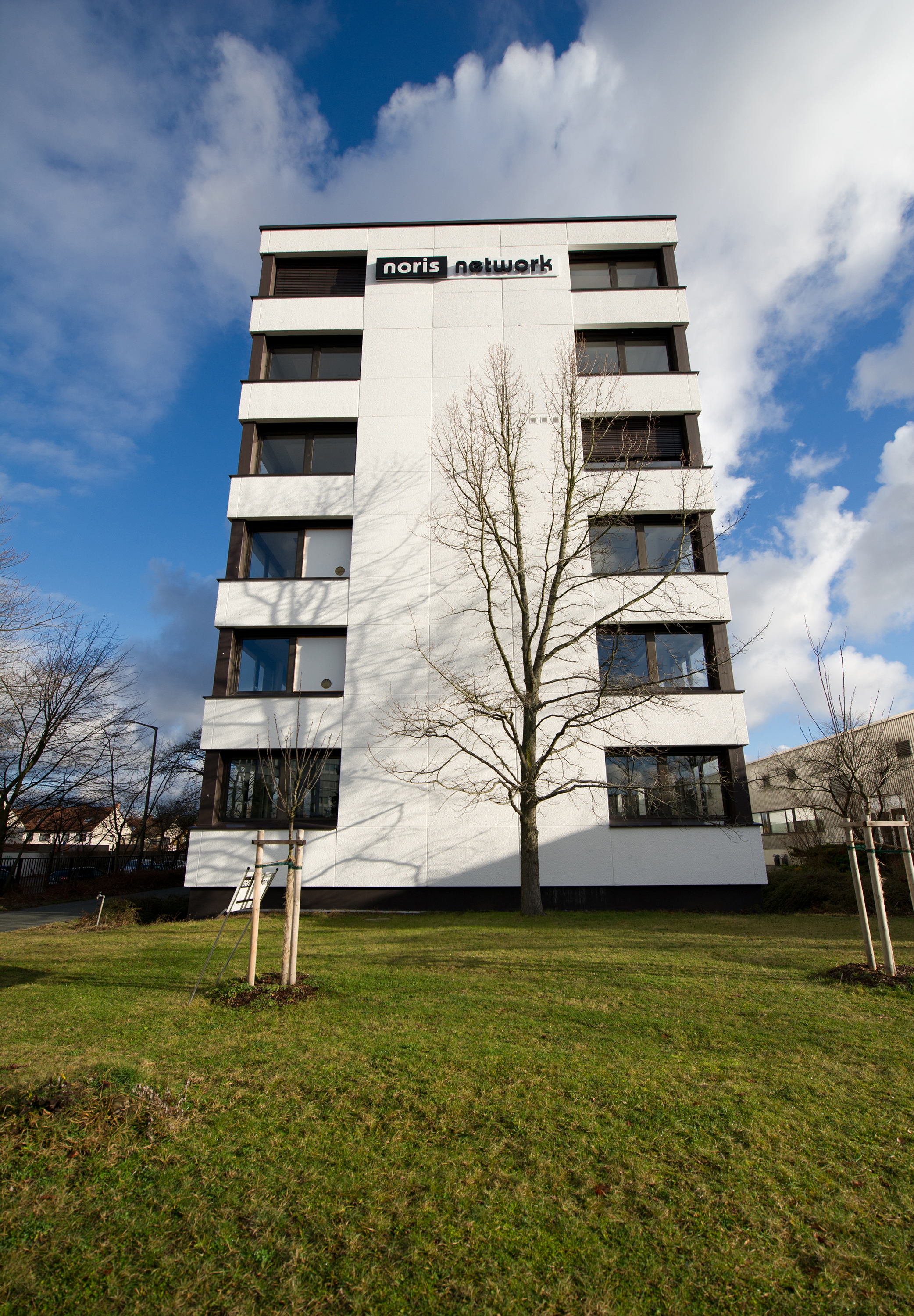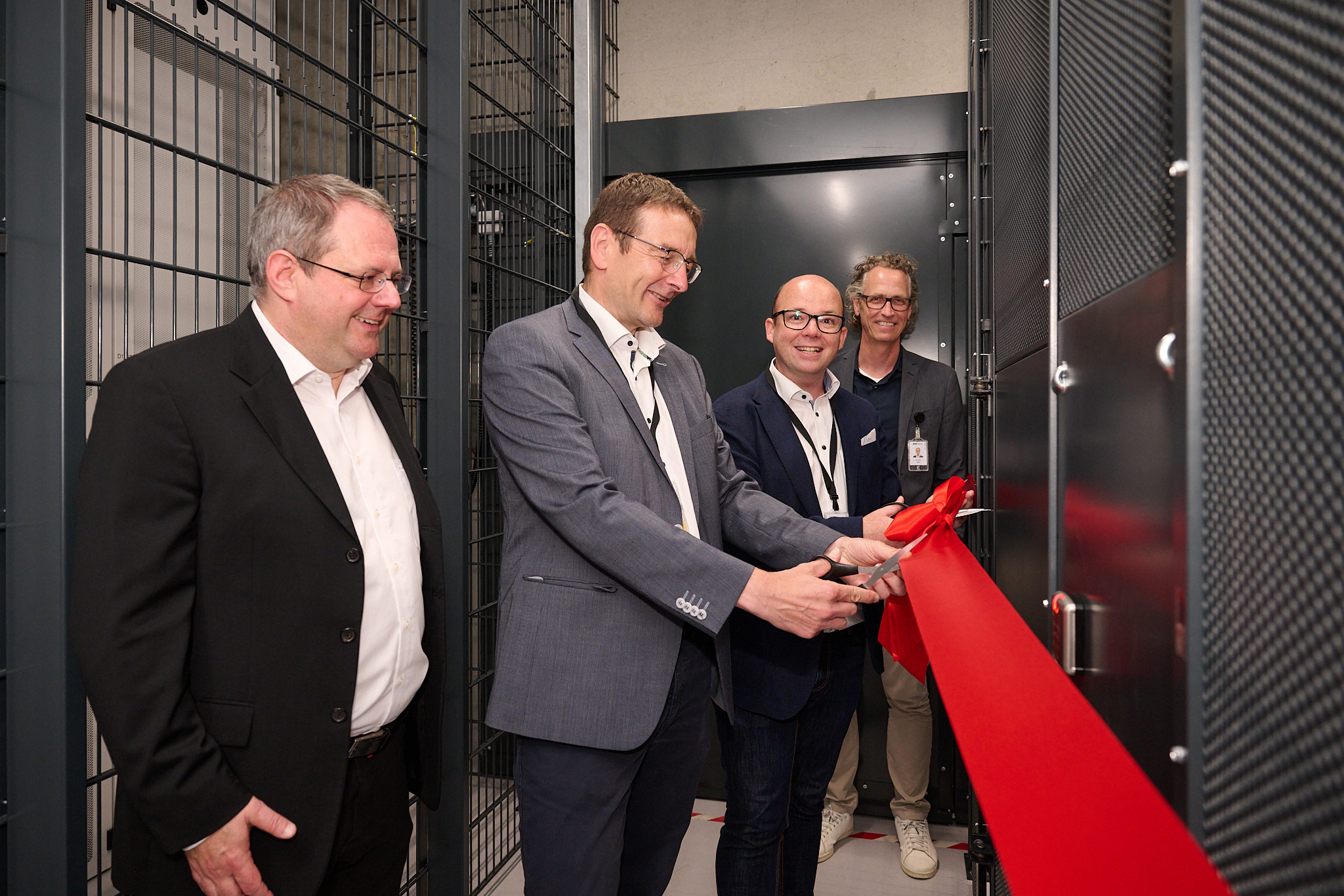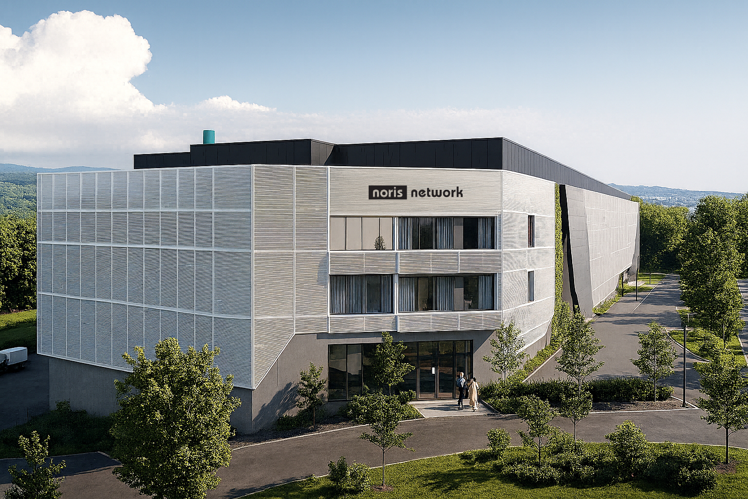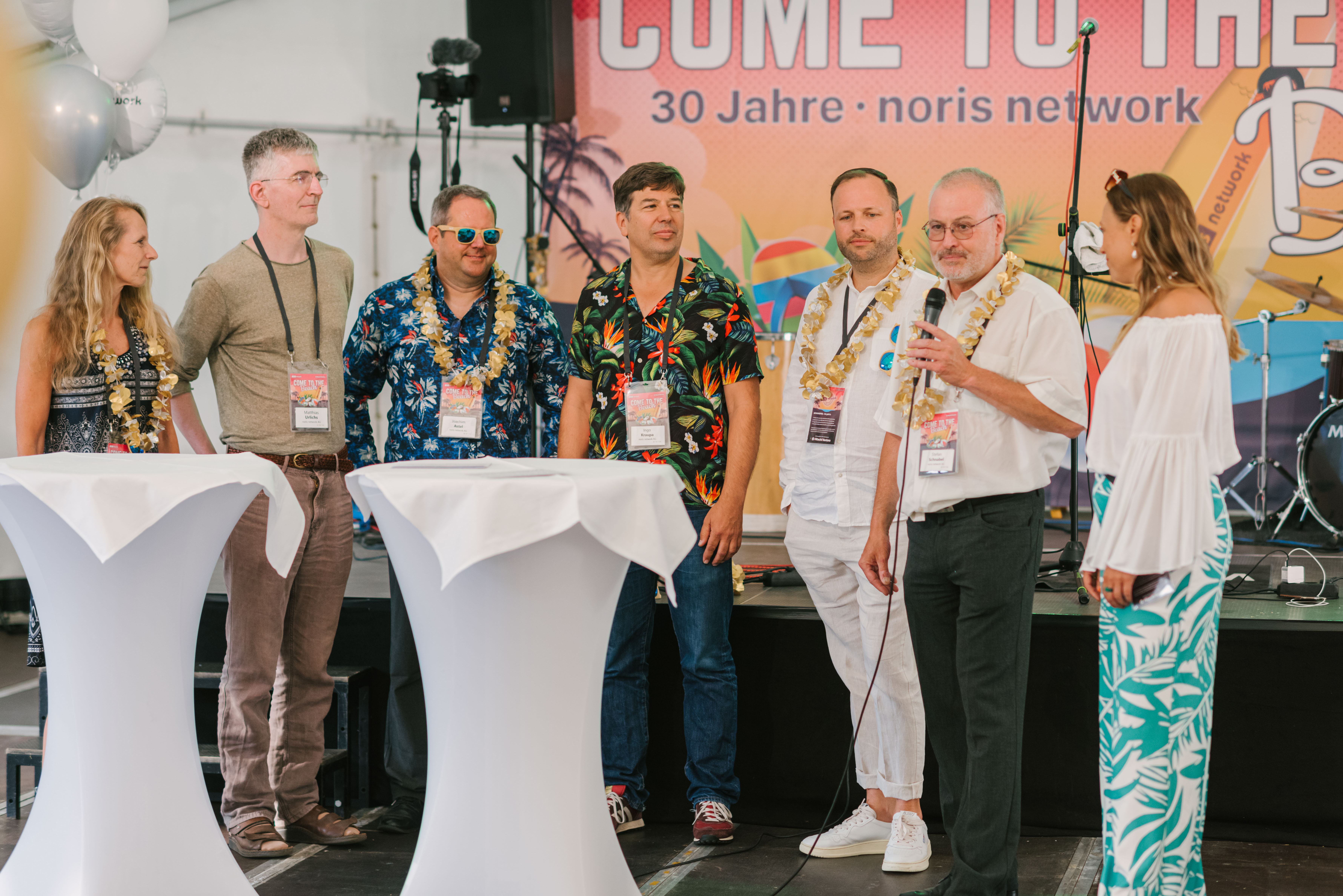 Grundsteinlegung am 12. September 2018 zum zweiten Bauabschnitt des Hochsicherheitsrechenzentrums München Ost von noris network: V. l.: Florian Sippel, Executive Vice President Datacenter, Joachim Astel, Vorstand, Ingo Kraupa, Vorstandsvorsitzender, Jürgen Städing, Vorstand, Stefan Schnabel, Vorsitzender des Aufsichtsrates, Stefan Keller, Executive Vice President Sales Marketing (alle noris network AG), 1. Bürgermeister der Gemeinde Aschheim, Thomas Glashauser (2. v. r.), Andrea Lengenfeld, Aufs
