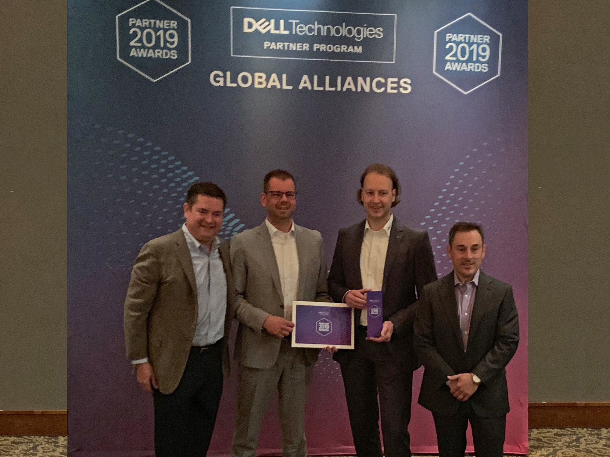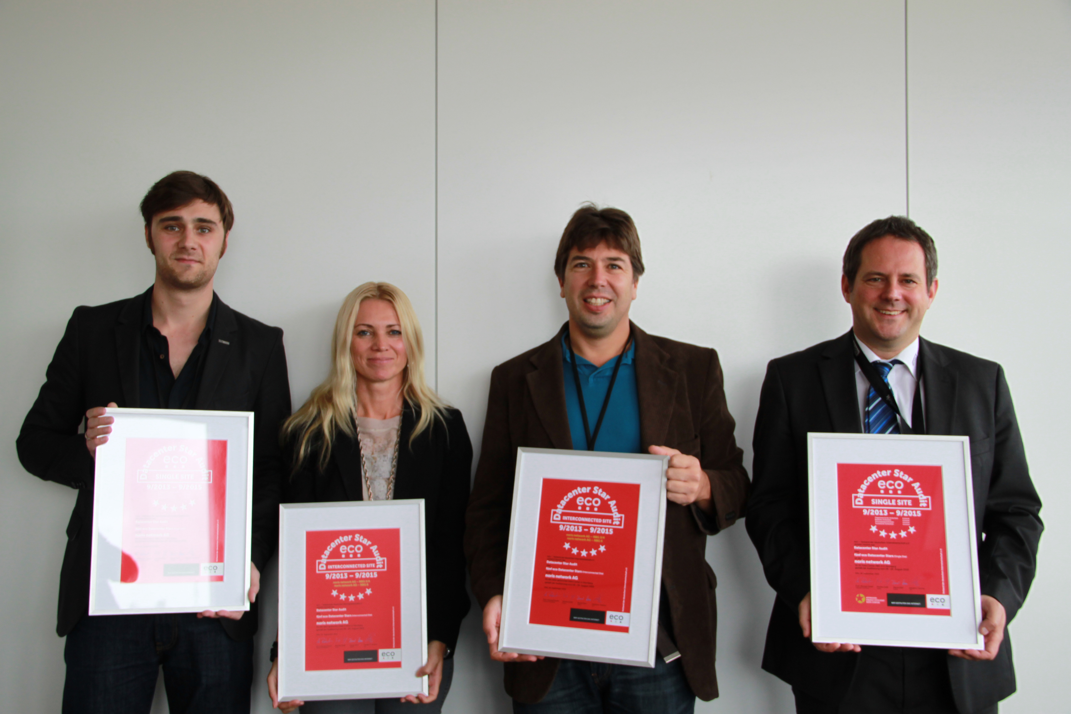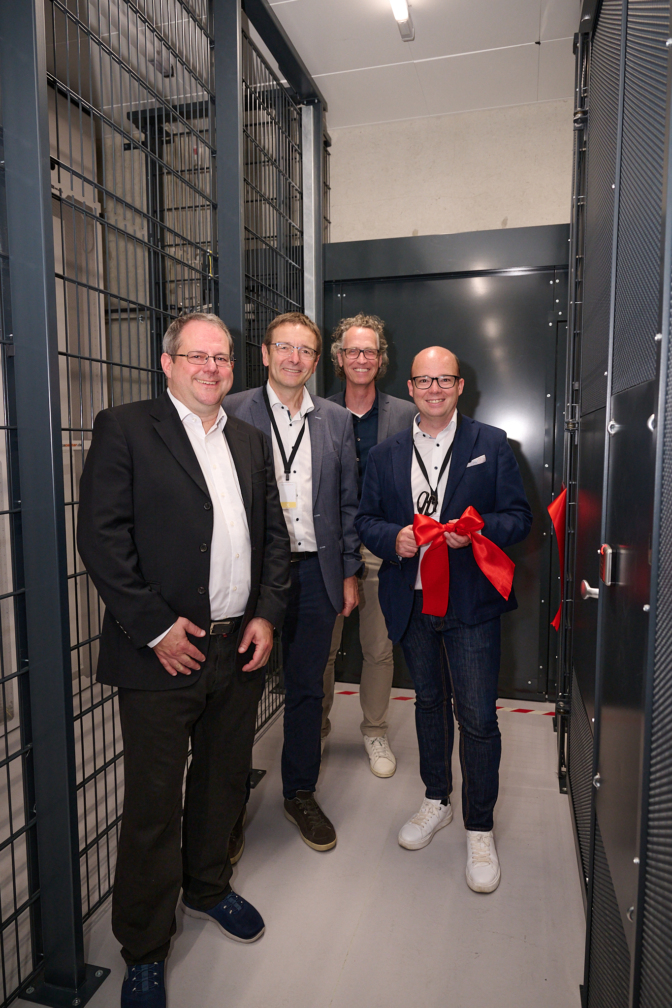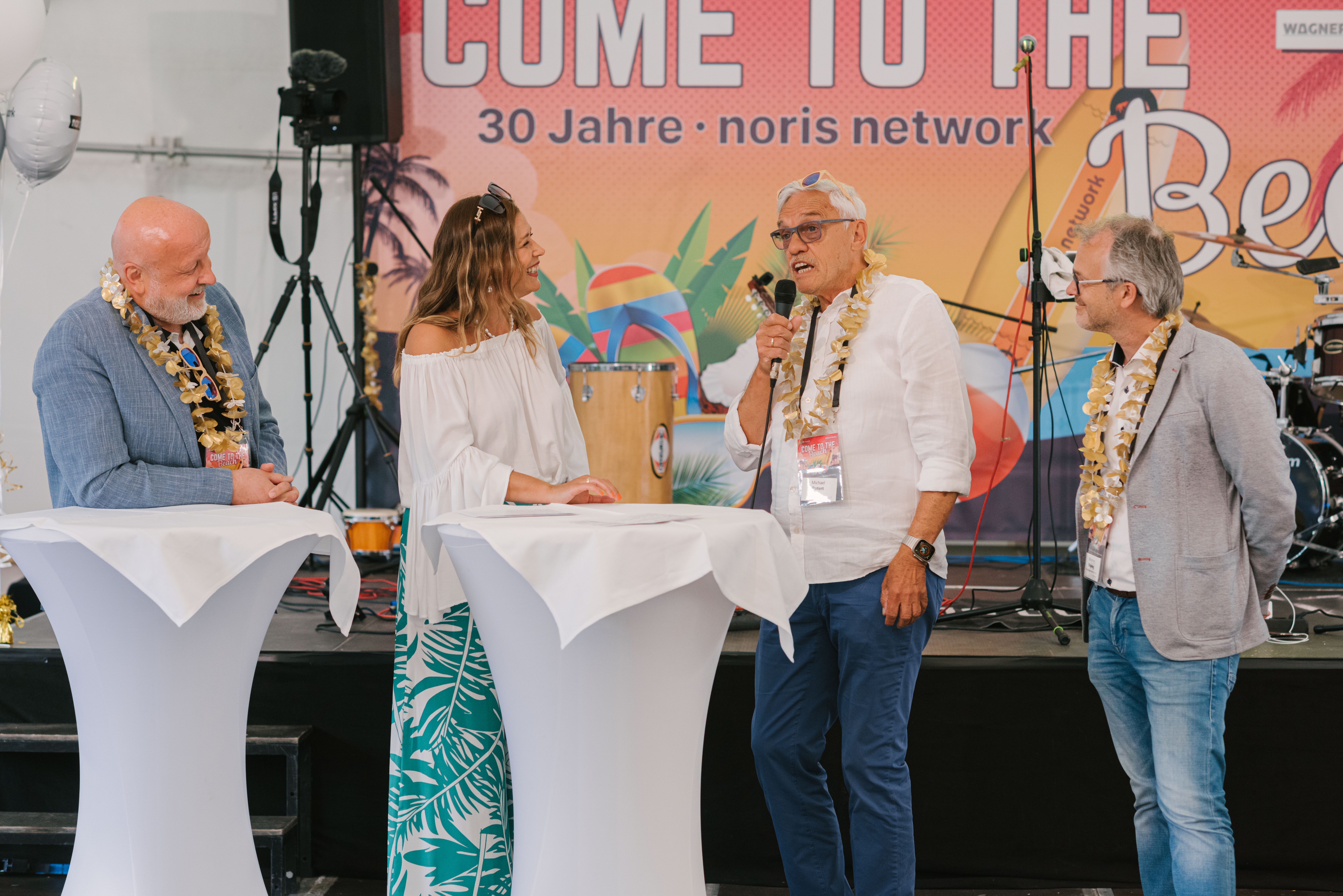 Freuen sich über das große Interesse: Florian Sippel, COO, noris network AG, Ingo Kraupa, CEO, noris network AG, Sonja Pierer, Business Consumption Director, Intel Germany Services GmbH, Marco Pfuhl, Director, Cloud Provider Business CEMEA, VMware Global Inc. mit Moderator Tom Meiler (v. l.)