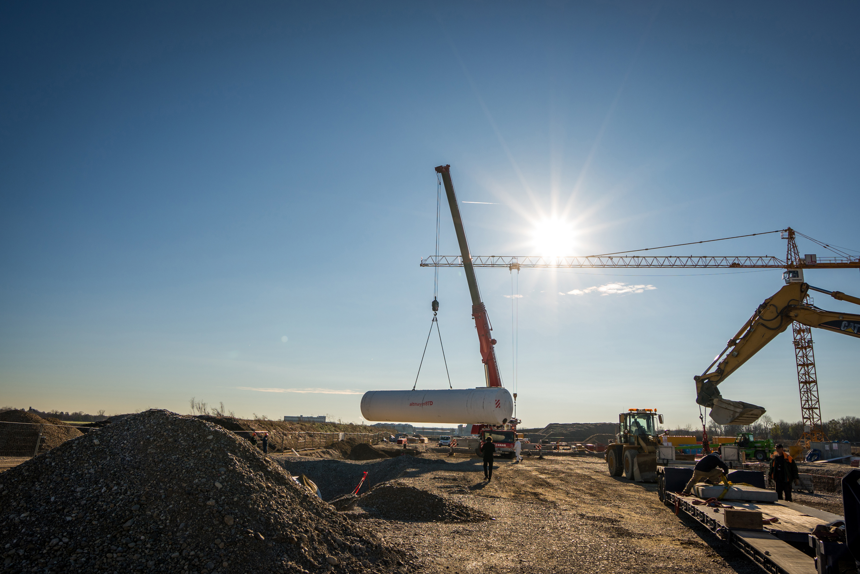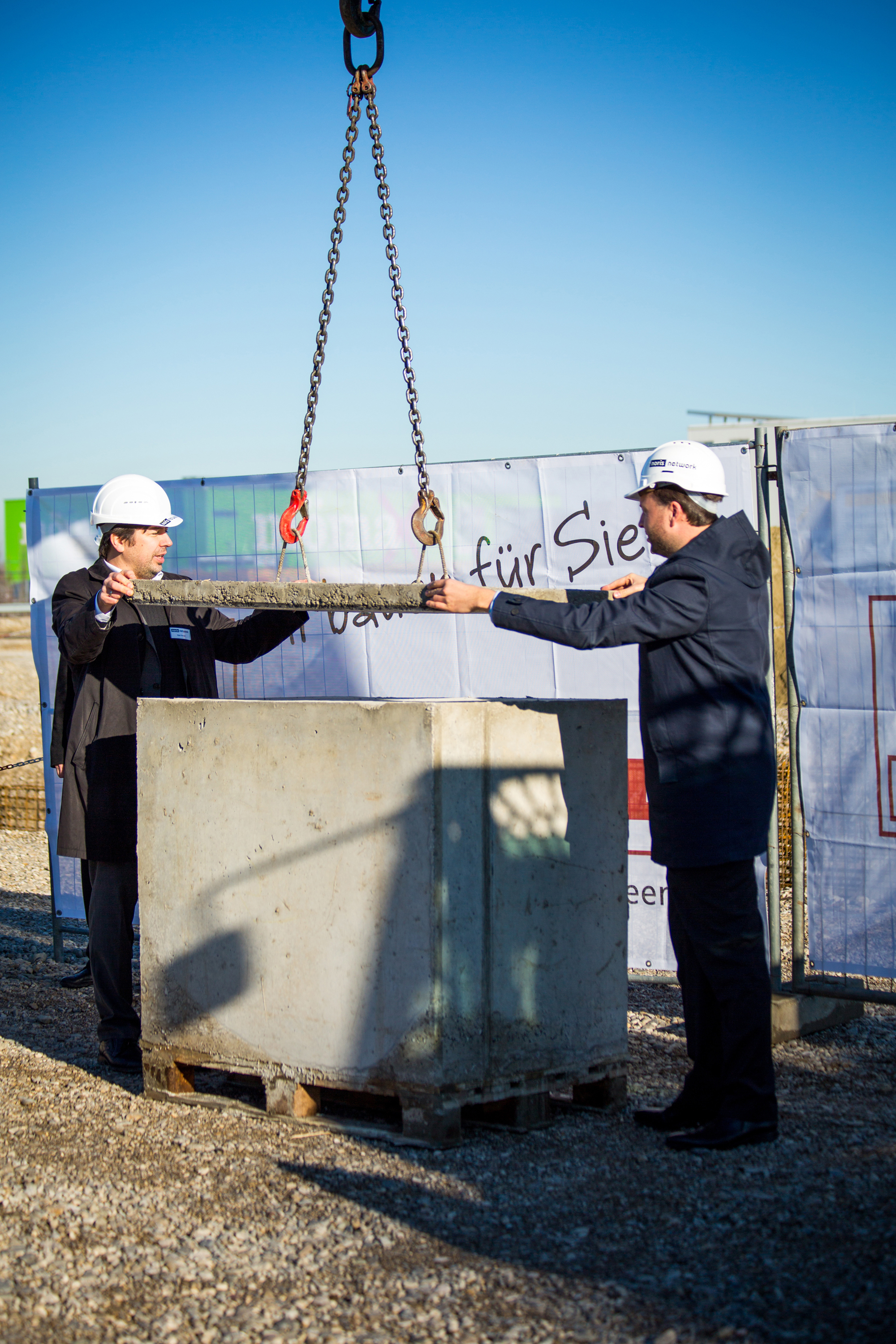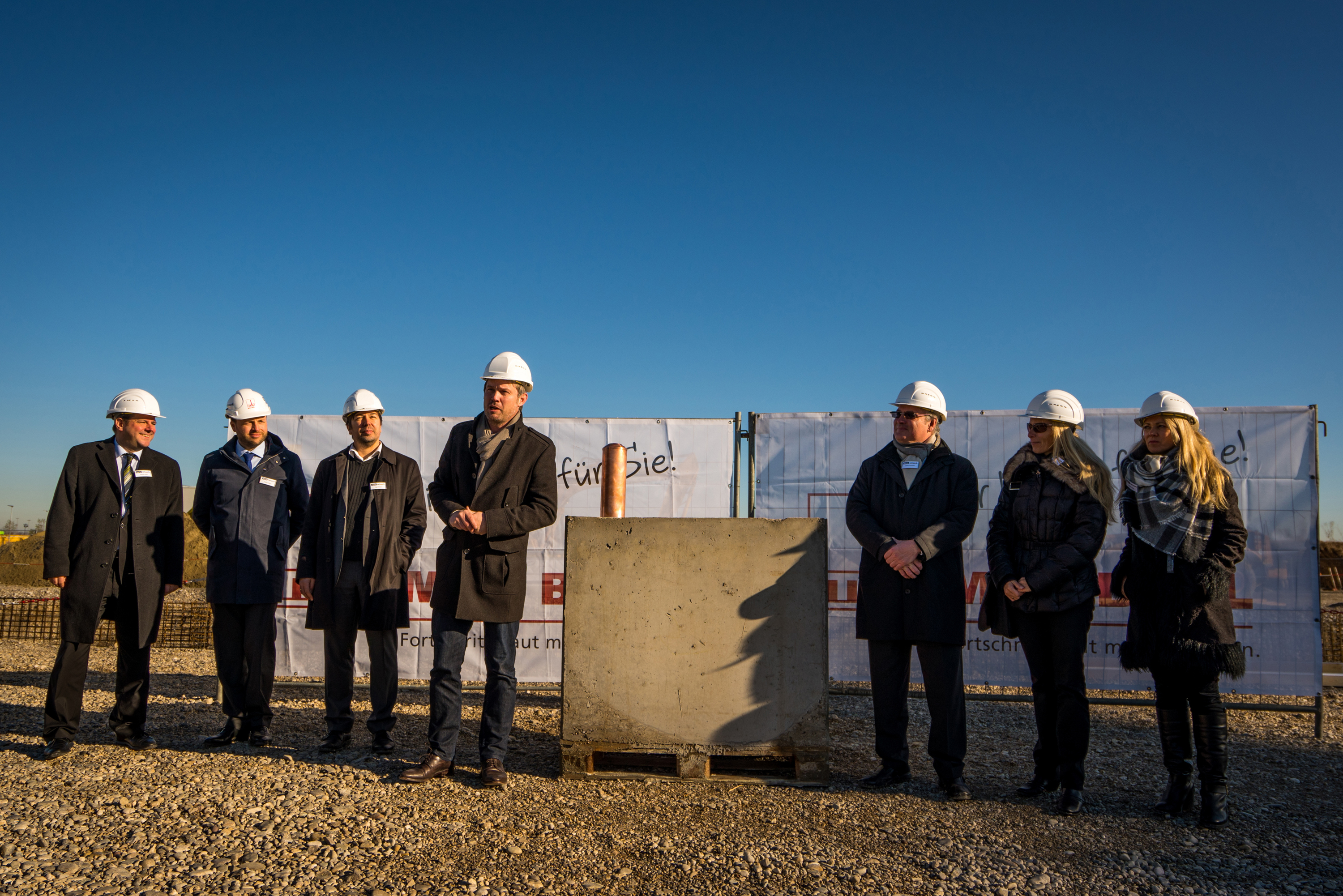 Bei der Grundsteinlegung des neuen Rechenzentrums von noris network am 24.11.2015 in Aschheim V. l. n r.: Joachim Astel, Vorstand der noris network AG, Florian Sippel, Projektleiter Rechenzentren bei der noris network AG, Ingo Kraupa, Vorstandsvorsitzender der noris network AG, Thomas Glashauser, 1. Bürgermeister Aschheim, Stefan Schnabel, Aufsichtsrat noris network AG, Andrea Lengenfeld, Aufsichtsrätin noris network AG, Kirsten Meier, Marketing bei noris network AG / Bildquelle: MOKATI Fotos und Film OHG