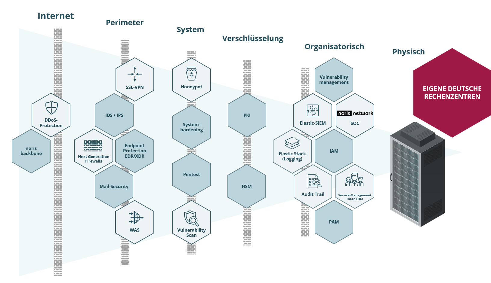 Die noris network AG ist mit ihren gesamten Geschäftstätigkeiten für ihre durchgängige Qualität und ihre Sicherheit im Service- und Informationssicherheitsmanagement nach ISO 20000-1, ISO/IEC 27001 und ISO 9001 zertifiziert. Im Bereich „Sicherheitsmanagement für bauliche Objekte“ ist noris network als erster Rechenzentrumsbetreiber nach VdS-Richtlinie 3406 zertifiziert. Zudem sind die maximalen Verfügbarkeits-, Schutz- und Energieeffizienzklassen des Rechenzentrums München Ost nach EN 50600 bestätigt. Die Rechenzentren Nürnberg Mitte und Nürnberg Süd sowie München Ost haben das ISO 27001-Zertifikat auf Basis von IT-Grundschutz des BSI erhalten. Am Standort Nürnberg Süd bietet noris network die einzigartige Möglichkeit, ein Colocation-Rechenzentrum mit dem höchsten Sicherheitsstandard EN50600, TÜViT TSI Level 4 und ISO/IEC 22237 zu nutzen. Weitere Zertifikate, die der IT-Dienstleister vorweisen kann, sind PCI DSS, TISAX und ISO 14001 Umweltmanagement.