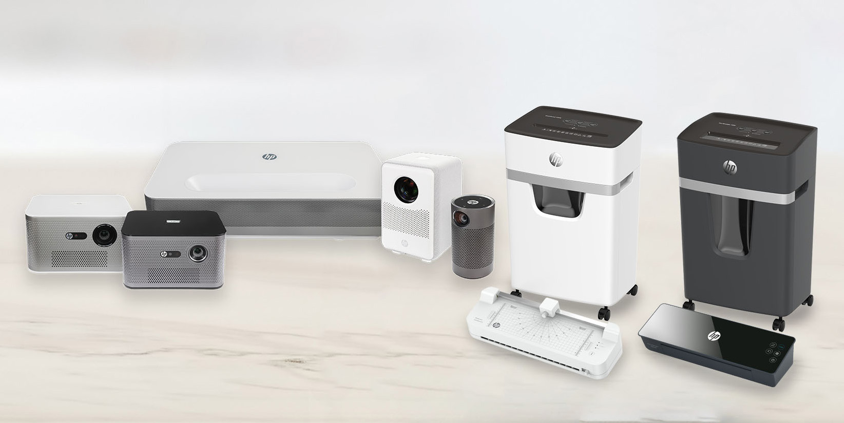 Aktenvernichter, Laminiergeräte und Projektoren der Marke HP