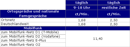 In der Zeit von 9 bis 18 Uhr können Kunden weiterhin für den bekannten Spitzenpreis von 1,68 ct/Min. innerdeutsch im Festnetz telefonieren. In der restlichen Zeit beträgt der Preis nach wie vor 2,50 ct/Min. Die 01086 behält somit die einfachen und transparenten Preisstrukturen bei.