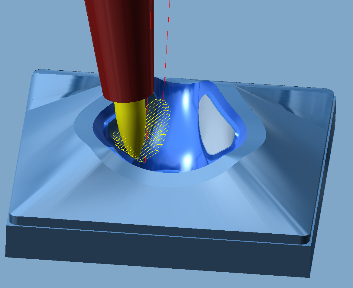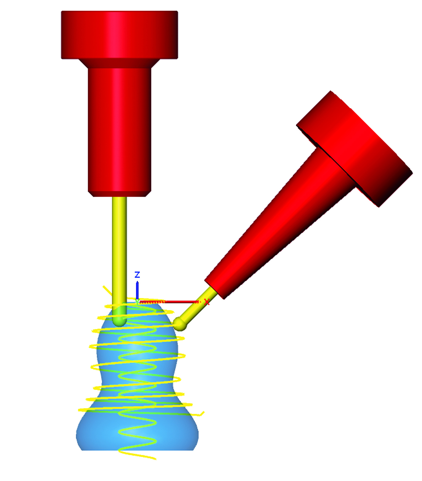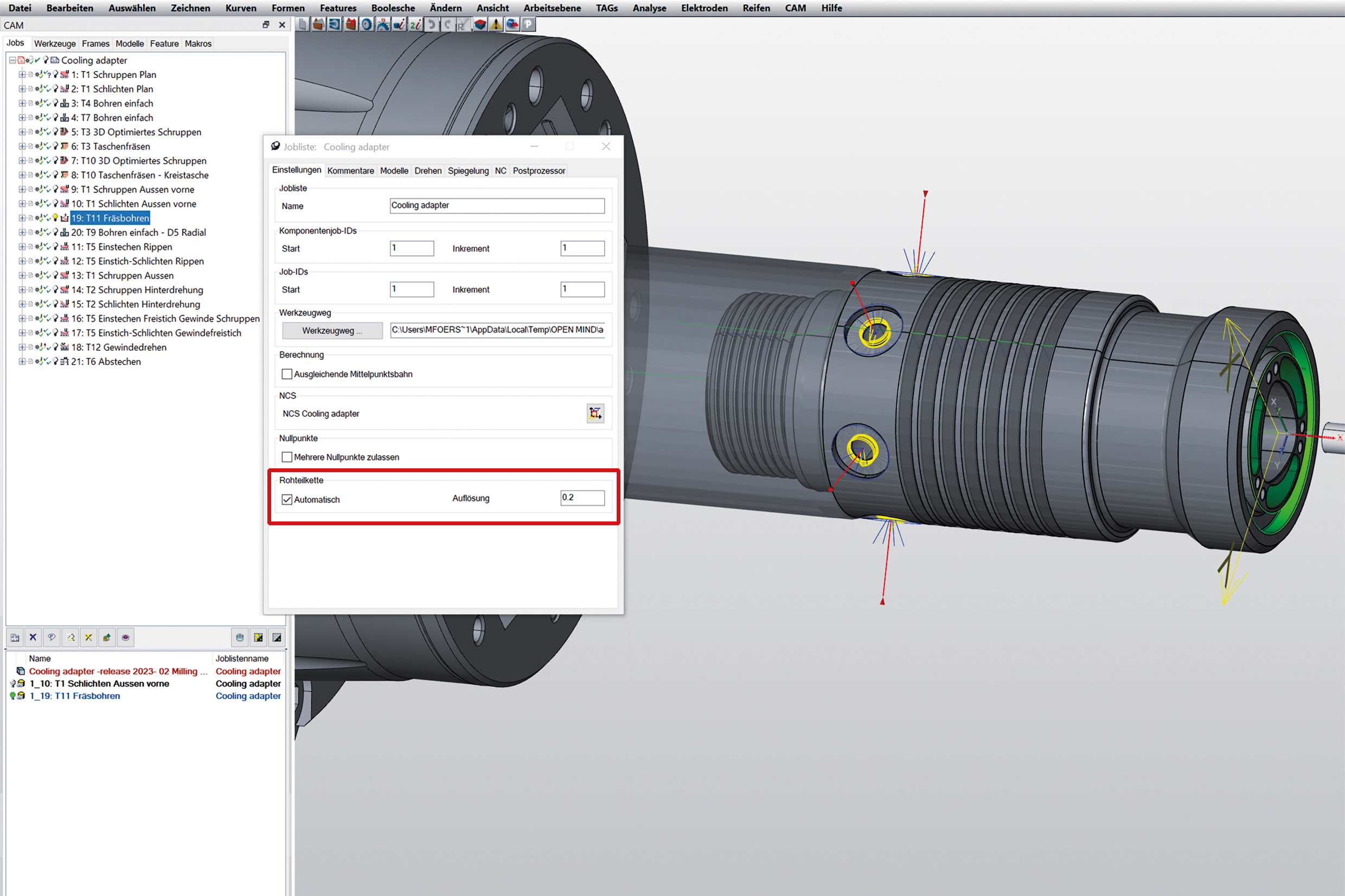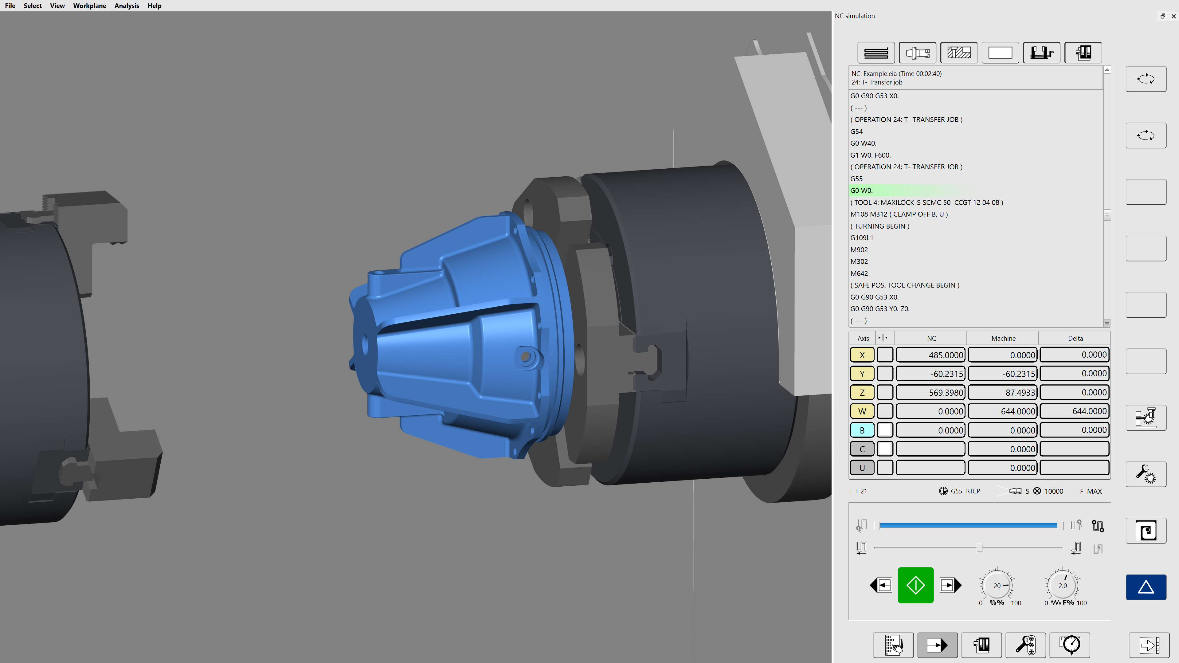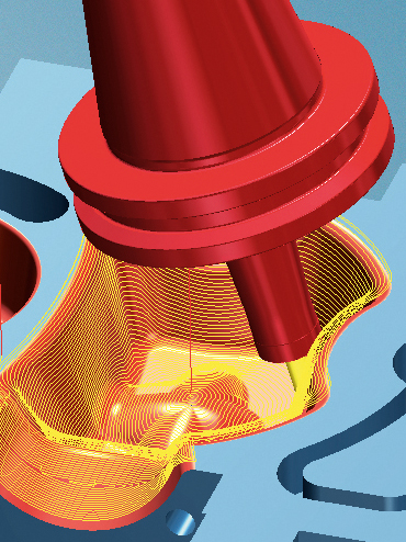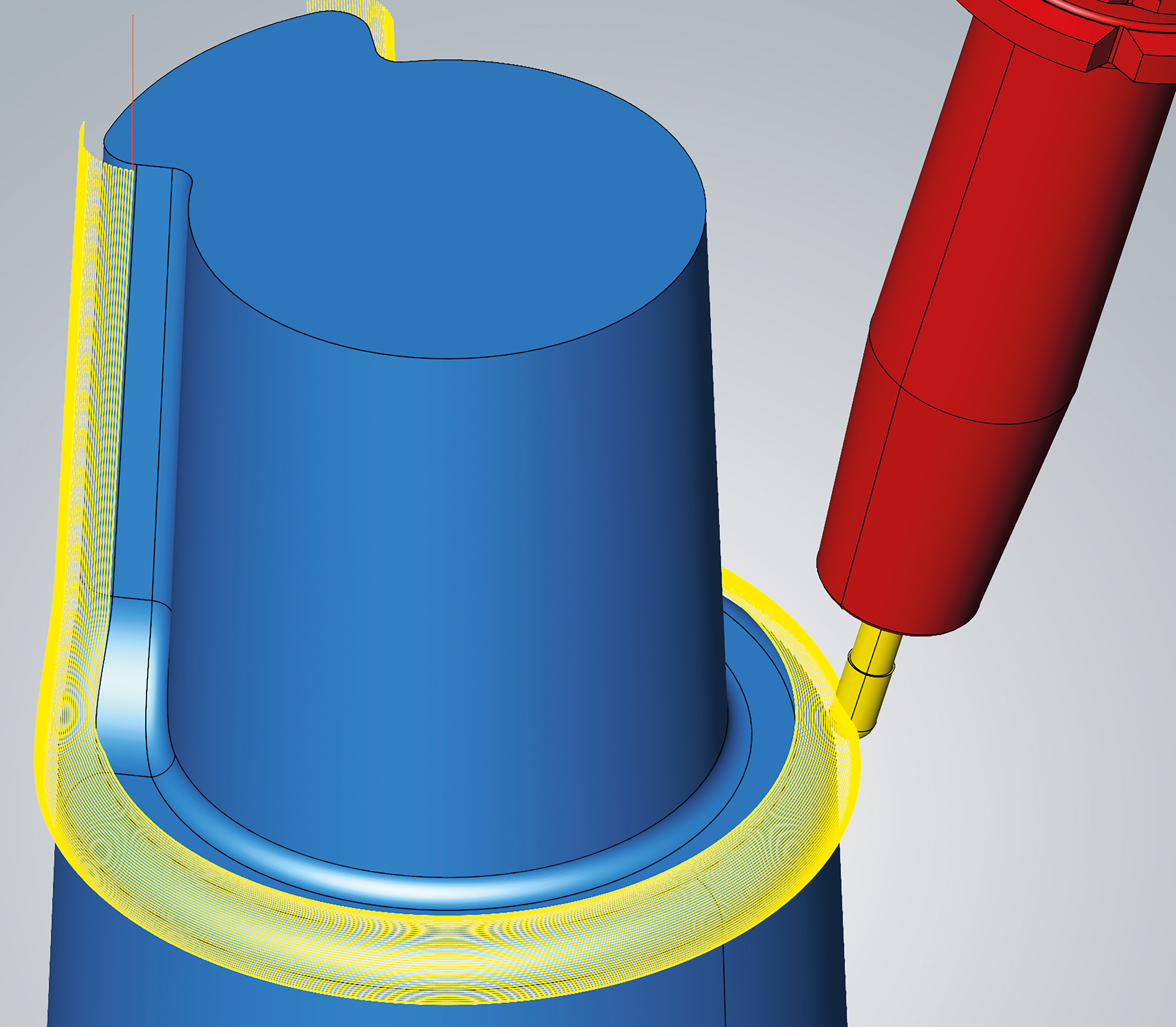 Job-Berechnung mit virtueller Maschine: präzisere und optimierte Werkzeugwege, besonders bei engen Platzverhältnissen oder wenn der Maschinenkopf nah am Bauteil oder an den Maschinenlimits arbeitet