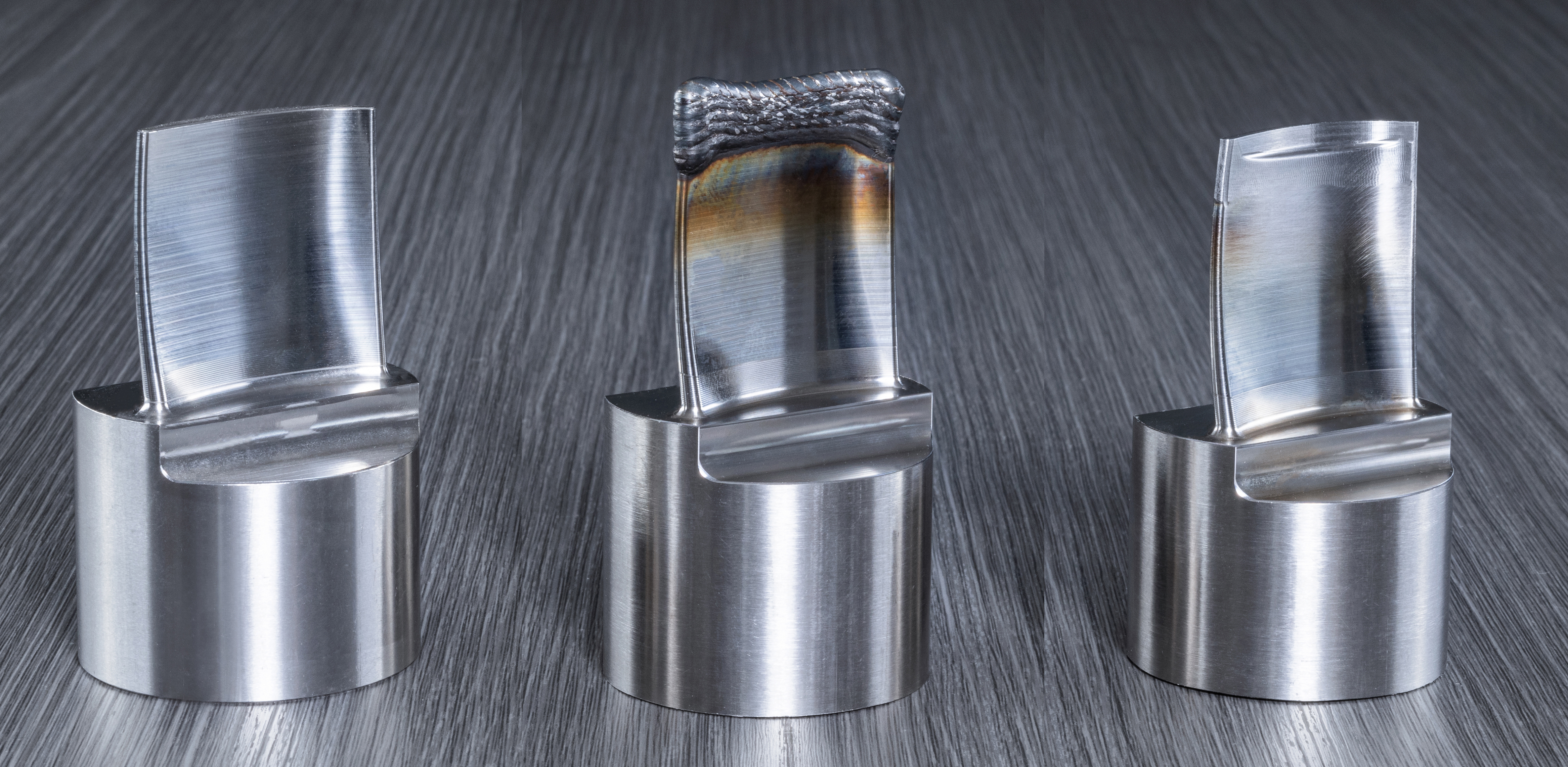 Smart reparieren in drei Stufen mit hyperMILL: vorbereitetes Turbinenschaufelblatt, Blatt mit Materialauftrag und fertiges Blatt nach additiver und subtraktiver Bearbeitung (von links nach rechts)