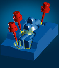The complete finishing milling strategy is optimally suited to machining flat and steep areas in a single operation. All users need to do is specify a slope angle at the point where the machining passes from flat to steep areas. By entering a clearance area for the tool, the smoothest approach and retract strategy is automatically calculated for the approach and retract points. This means that users no longer need to choose between different strategies.