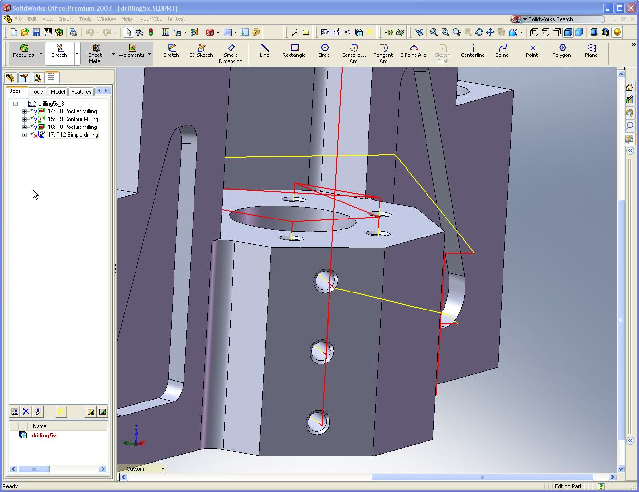 Feature- und Makrotechnologie sind wesentliche Bausteine für die automatisierte Programmierung. Die Featureerkennung von hyperMILL® macht im CAD-angelegte Geometrieinformationen für die CAM-Programmierung nutzbar. So erkennt die automatische Featureerkennung an Solids und Flächenmodellen Geometrien wie Bohrungen, Stufenbohrungen mit und ohne Gewinde sowie offene und geschlossene Taschen. Dabei werden die Parameter, die für die Programmierung und Werkzeugwahl erforderlich sind, generiert. Zudem ermöglicht das Programmieren mit Featuren auch ein einfacheres Ändern. Bei Änderungen an der Geometrie oder bei den Technologieparametern sind die Anpassungen nur im Feature vorzunehmen. Bei erneuter Berechnung werden diese Daten automatisch berücksichtigt. Die Makros ermöglichen in hyperMILL® das Verknüpfen von Bearbeitungsstrategien und Werkzeugen mit Featuren. Sie enthalten die Bearbeitungsvorschrift für charakteristische Bereiche der Feature - wie zum Beispiel den Gewindedurchmesser, die Tiefe der Bohrung, Senkungsart oder, ob es sich um eine geschlossene oder offene Tasche handelt. Die Makrodatenbank sorgt für eine übersichtliche Speicherung einmal erstellter Makros. Durch hinterlegte Kommentare und Grafiken sind die Inhalte für jeden Anwender nachvollziehbar.