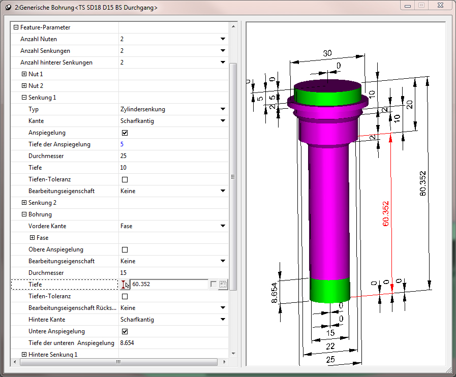 Ein Baustein für die optimale Nutzung der intelligenten Makros ist der neu entwickelte Featuretyp, das generische Bohrfeature. Bohrungen müssen hier nicht mehr mit einzelnen Features definiert werden, sondern alle Bohrungen lassen sich jetzt in dem einen Featuretyp abbilden. Das bedeutet, es muss nicht mehr in normale, Senkbohrungen oder freie Bohrungen eingeteilt und nach unterschiedlichen Stufen, Senkungen oder Nuten festgelegt werden. In jeder Stufe kann man dann auch wieder spezielle Eigenschaften, wie Gewinde oder Passung definieren. Dadurch, dass sich alle Bohrungen nur mit einem Featuretyp definieren lassen, ist im zweiten Schritt eine effektivere Automatisierung zur Programmerstellung möglich.