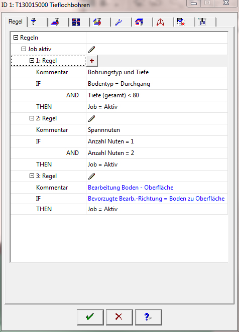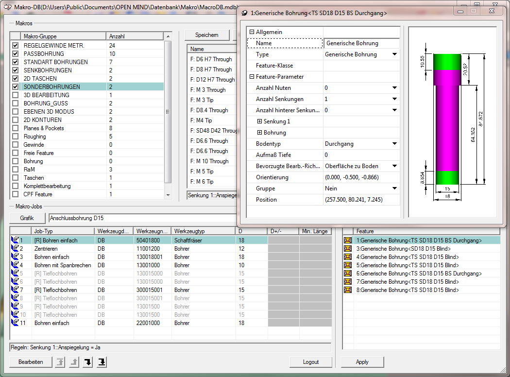 By using generic features, different holes can be programmed with a single macro that contains all the possible machining steps using simple IF-THEN queries. When the machining steps are assigned to the various features, the rules are applied to automatically choose between countersinks, threads or fits.