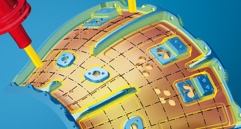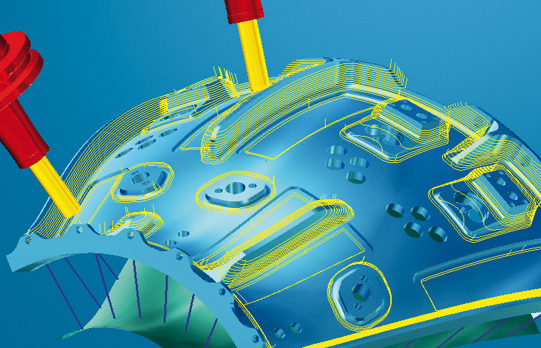 Viele Teile, etwa Reifenformen oder Gehäuseteile mit Konturen, sind von ihrer Basis her aber nicht flach, sondern gekrümmt. Diese konnten zwar bisher auch schon mit 5Achs-Maschinen bearbeitet werden, das CAM-Programm musste aber in mehreren Schritten erstellt werden. Dabei hatte es der Programmierer mit einer hohen Zahl von Einzelbereichen und vielen Umsetzbewegungen zu tun, die insgesamt einen hohen Programmieraufwand bedeuteten. Daher hat OPEN MIND als erster CAM-Hersteller eine neue Strategie für die 5Achs-Form-Offsetbearbeitung entwickelt.