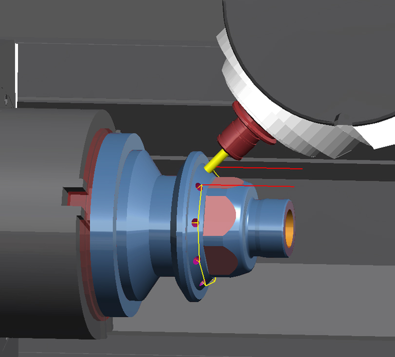 Wenn die Aufspannsituation nicht zu den theoretisch möglichen Werkzeugbahnen passt, können diese mit hyperMILL® sehr komfortabel geändert werden. Die zum Verbinden der restlichen Fräsbahnen benötigten Eilgangbewegungen werden dann automatisch für den Fräsbereich geprüft und kollisionsfrei berechnet.