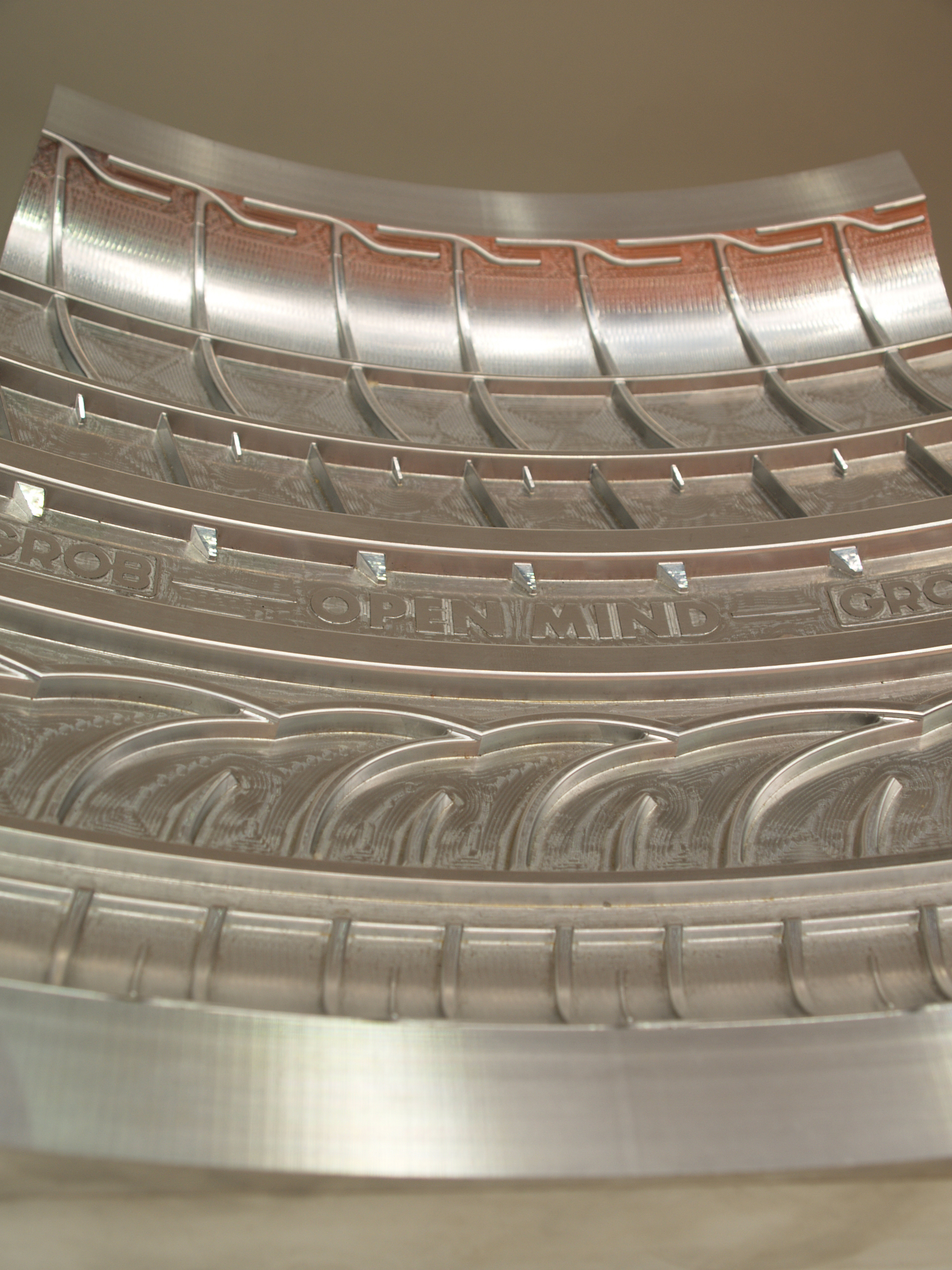 Die Bearbeitung der komplexen Geometrien in Reifenprofilen wird durch die Automatisierungstechniken in hyperMILL® so umgesetzt, dass alle Werkzeugbewegungen möglichst effizient, dabei aber für Werkzeug und Maschine schonend berechnet werden. Da hyperMILL® automatisch kollisionsfreie Werkzeugpositionen berechnet, können Bearbeitungen mit unterschiedlichen Werkzeugorientierungen in einer einzigen Operation schnell und einfach generiert werden. Mit der automatischen Werkzeuganstellung reduziert sich der Programmieraufwand vor allem bei filigranen Strukturen erheblich. Durch die simultane, kollisionsgeprüfte Bewegung fährt der Fräser zudem dichter am Teil. Leerwege werden vermieden.