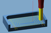 Im Bereich des 3D-Schruppens wurde das Taschenfräsen verbessert. So kann für die Bearbeitung von Taschen die Rampe kontinuierlich in eine Richtung gefahren werden. Die Tasche wird dann von außen nach innen ausgeräumt. Der Vorteil: Durch die kontinuierliche Einwärtsrampe werden die Werkzeugwege optimiert und "Zickzackbewegungen" vermieden. Die Funktion Job-Linking ist mit hyperMILL® 2012 auch für die 2D-Bearbeitung einsetzbar. Mehrere Bearbeitungsschritte, bei denen das gleiche Werkzeug verwendet werden kann, werden zu einem Arbeitsschritt zusammengefasst. Mit dem Job-Linking werden so Eilgang- und Leerwege reduziert.