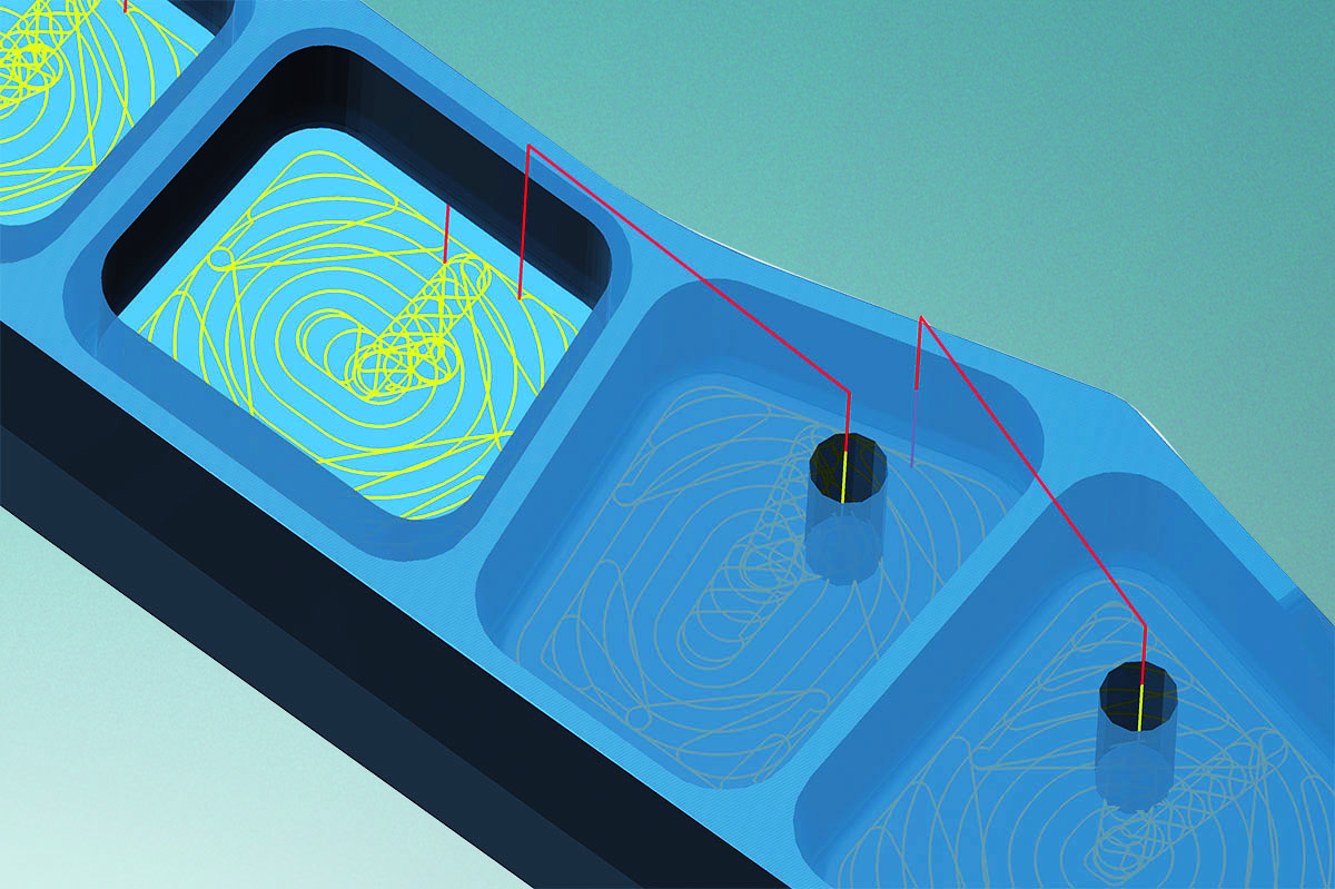 Offene und tiefe sowie steile und flache Bereiche von Kavitäten können in einem Job mit Kollisionsvermeidung abgearbeitet werden. Die von der Kollisionsvermeidung erkannten Restmaterialbereiche werden nun automatisch an den folgenden Job übergeben. Hierfür erfolgt dann wieder die optimale Werkzeugauswahl und -anstellung: zum Beispiel längeres Werkzeug oder geänderte Anstellung. Dieser Vorgang wiederholt sich, bis die Sollkontur erreicht ist. Für den CAM-Programmierer wird an der Stelle die Arbeit deutlich einfacher.