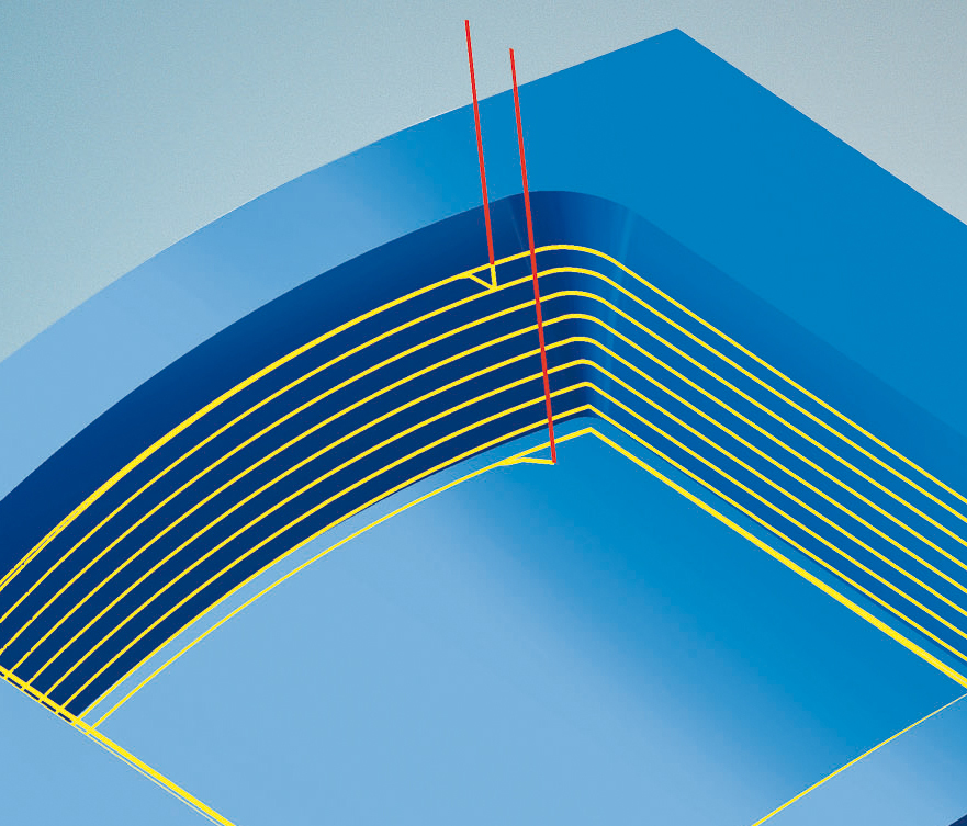 Zwei Beispiele für aktuelle Verbesserungen in hyperMILL®: Beim Ebenenschlichten folgt ein CAM-System normalerweise einfach den X- und Y-Koordinaten. Ist die Bodenfläche gekrümmt, ist das Fräsergebnis nicht optimal und viele Nachbearbeitungsschritte sind notwendig. Eine neue Funktion für das 3D-Form-Ebenenschlichten, ermöglicht in hyperMILL® jetzt das Referenzieren von gekrümmten Bodenflächen, wonach sich die Fräsbahnen dann ausrichten. Infolgedessen schmiegt sich der Fräser optimal entlang einer Begrenzungskante zwischen Boden und Wand an. Alle Zwischenebenen sind Offsets der Bodenfläche.
