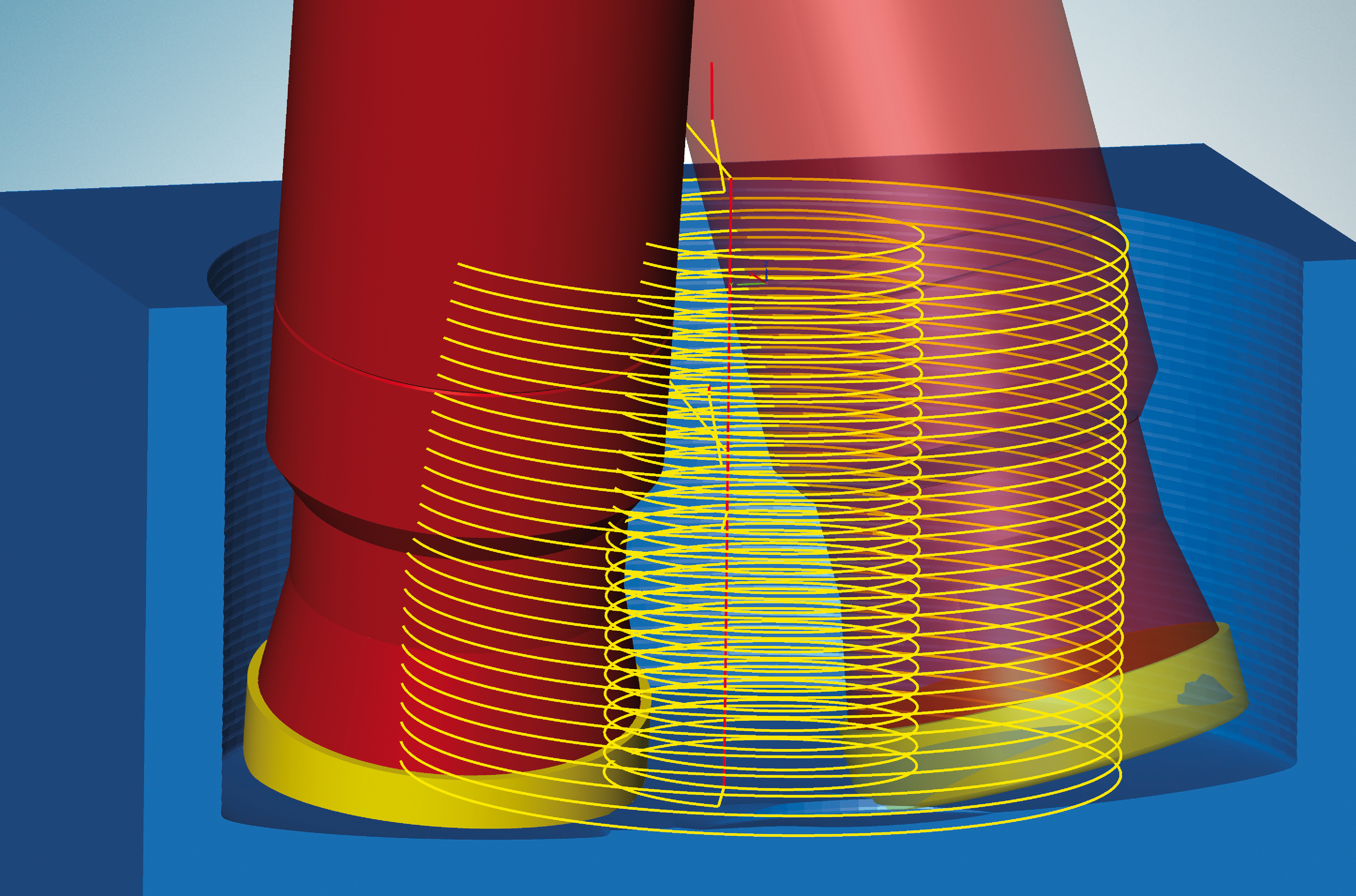 Wichtigste Erweiterung bei den 5Achs-Bearbeitungsstrategien in hyperMILL® ist das 5Achs-helikale Bohren. Dabei handelt es sich um einen Fräsbohrzyklus mit helixförmigen Werkzeugbahnen. Das Werkzeug taucht schnell in das Material ein. Durch die 5achsige Anstellung des Fräsers ist eine effiziente und besonders werkzeugschonende Bearbeitung möglich.