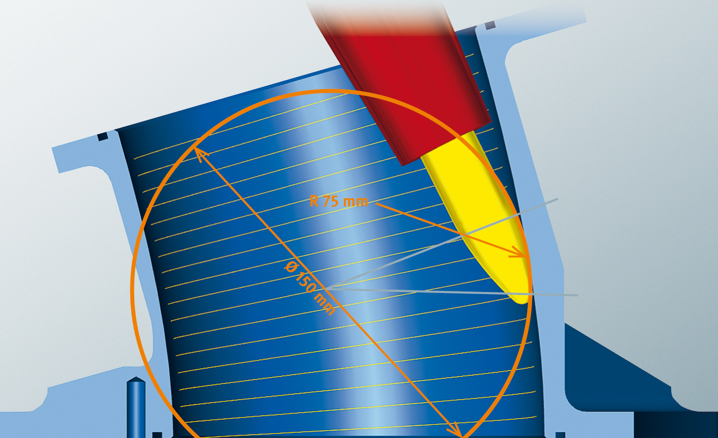 Für den konischen Tonnenfräser wurde die Form noch weiter verbessert. Das sehr kompakte Werkzeug zeichnet sich durch einen extrem großen Radius aus, der somit eine optimale Anstellung an die Flächen erlaubt. Ein einfaches Beispiel verdeutlicht die Einsatzmöglichkeiten des Werkzeugs. Der konische Tonnenfräser hat einen Radius von 500 mm, dieser entspräche einem Kugelfräser-Durchmesser von 1 000 mm. Es ist leicht zu erkennen, dass solche Fräsausgaben mit den konventionellen Werkzeugen nicht umzusetzen sind.