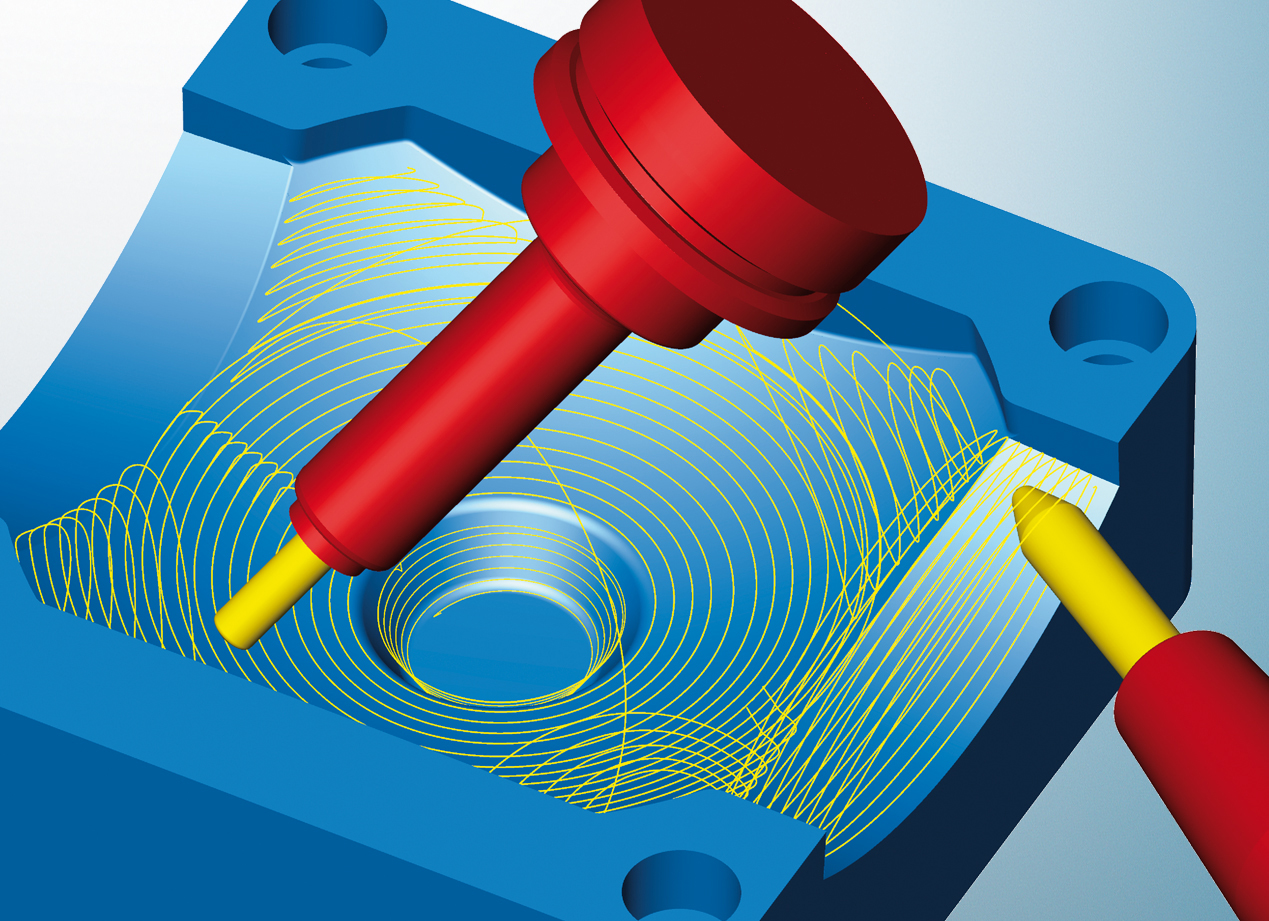 Weitere neue Strategien für die 5Achs-Bearbeitung beschleunigen die Fertigung und schonen Werkzeug sowie Maschine. Die konische Interpolation führt mit der Option „Eilgang optimiert“ Werkzeuganstellungen auf konische Weise um den Pol herum. So werden Singularitäten vermieden und simultane 5Achs-Bewegungen generiert.