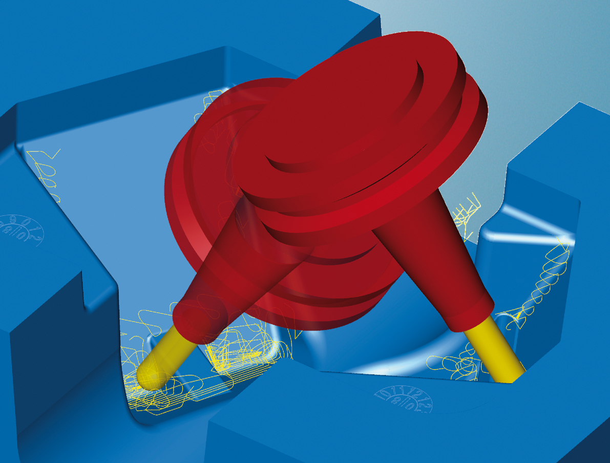 Das 5Achs-optimierte Restmaterialschruppen erstellt beim High-Speed-Cutting (HSC) optimierte Werkzeugbahnen für die Restmaterialbearbeitung – ausgehend von einer vorangegangenen Schruppoperation. Die Definition der Anstellungen für die B- und C-Achse ist sehr einfach. Der Anwender kann wählen, ob er die Anstellung im „3D Modus“ automatisch innerhalb eines festgelegten Winkelbereichs erstellt oder aus der Ebenennormalen generiert. Alle Verbindungswege zwischen den Anstellungen sind optimiert und vollständig kollisionsgeprüft. Diese indexierte Bearbeitung bietet vielfältige Vorteile: Kürzere Werkzeuge sorgen beispielsweise für mehr Stabilität und Performance. Insbesondere tiefe Kavitäten und schwer zugängliche Bereiche sind mit diesem Zyklus ökonomisch zu bearbeiten.