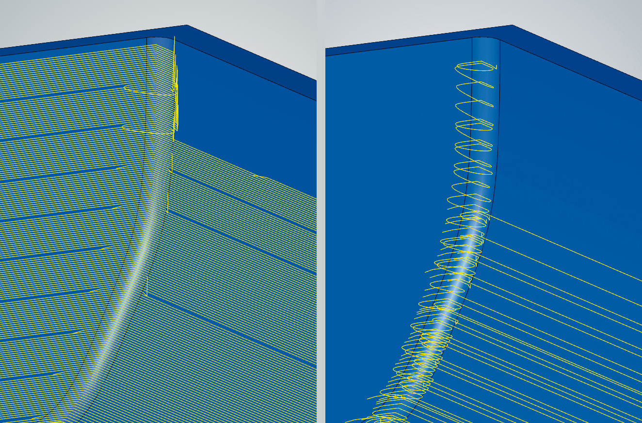 Die 3D-Bearbeitungsmethode „Restmaterialschruppen“ punktet in der neuen Version mit einer weiter optimierten Zustellstrategie. Die Option „Zustelloptimierung verwenden“ errechnet im Zusammenhang mit den Werten „Zusätzliche Spandicke und -tiefe“ die optimalen Zustellwerte. So kann der Anwender die Bearbeitung an die Gegebenheiten des Werkzeugs anpassen. Vorteil: Eine große Schneidenlänge des Werkzeugs lässt sich optimal ausnutzen und durch den Parameter „Maximale Zustellung“ exakt steuern.