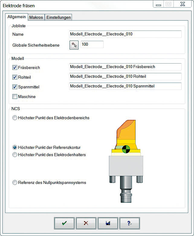 Die in hyperCAD®-S konstruierten Elektroden werden direkt im CAM-System weiterverarbeitet. Der Anwender wählt einfach die entsprechende Elektrode aus und beginnt die Programmierung. Hierfür steht ein eigenes Dialogfenster zur Verfügung, in dem mit wenigen Klicks die Fräsbearbeitung für die Elektrode spezifiziert wird. hyperMILL® erzeugt dann automatisch die Jobliste mit allen relevanten Parametern.