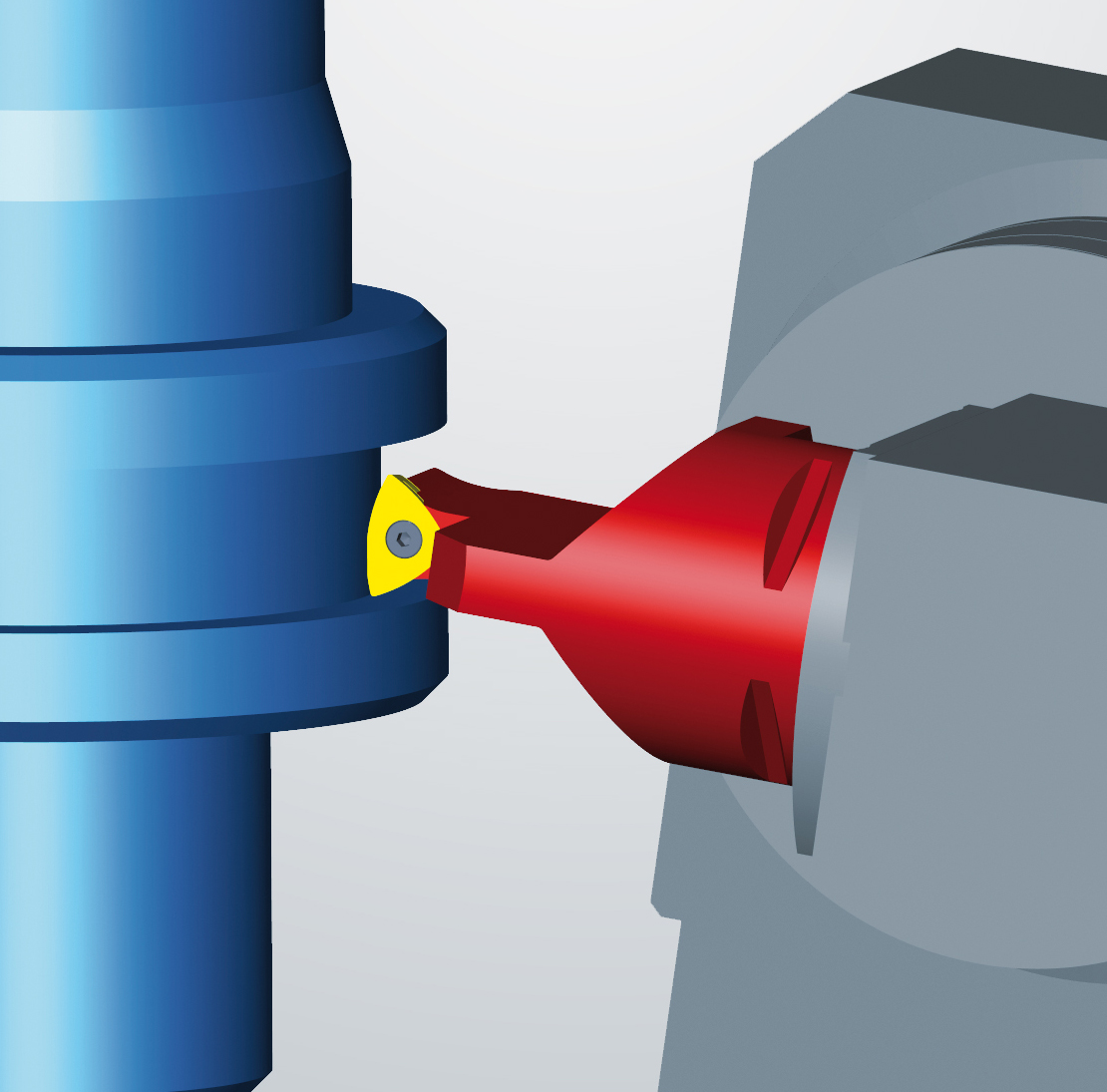 rollFEED®-Drehen ermöglicht als 3-Achs-Dreh-Bearbeitung das Abrollen der kompletten Kontur des Schneideinsatzes auf beliebig geformten, rotationssymmetrischen Oberflächen. Dabei wird durch horizontales Schwenken der B-Achse mit gleichzeitiger Kompensation über die X- und Z-Achse die Schnittbewegung erzeugt. Damit können Nuten in einer Bewegung mit nur einem Werkzeug bearbeitet werden. Die CAM-Strategie führt das Werkzeug automatisch von der ersten Planfläche über die Zylinderfläche zur zweiten Planfläche. Dank der Kombination von Roll- und Drehbewegungen lassen sich selbst Werkstücke mit großen Radien kollisionsgeprüft und somit prozesssicher fertigen. Die hyperMILL®-rollFEED®-Turning-Strategie ist perfekt auf die drei rollFEED®-Komponenten, Schneidplatten, Werkzeugsystem sowie Aggregat von Vandurit angepasst. Mit letzterem erlaubt Vandurit die Nachrüstung von Drehmaschinen ohne dritte Achse.